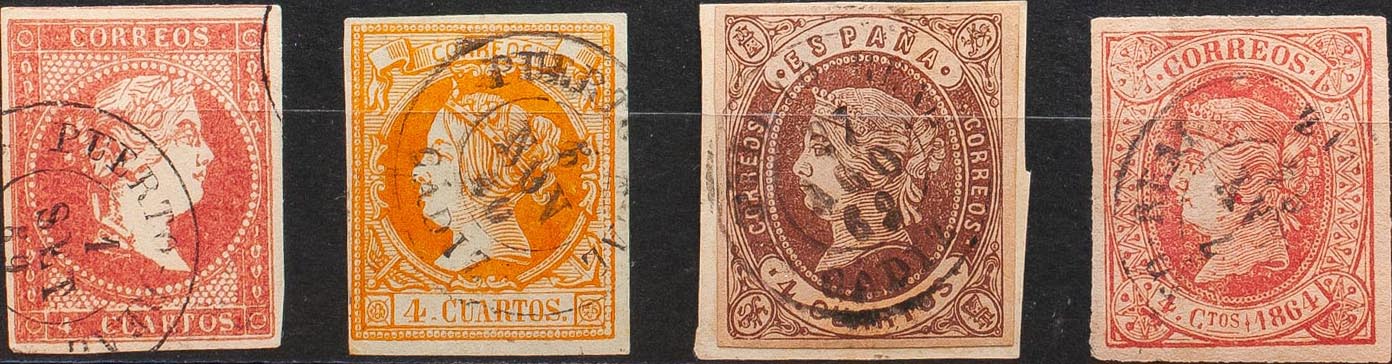 48, 52, 58, 64. (1855ca). Set of four 4- cuartos stamps red, yellow, brown and pink, unused with PUERTO-REAL / CADIZ postmark. MAGNIFICENT.