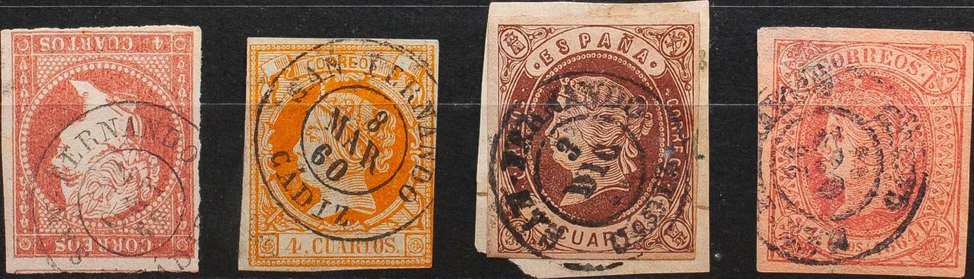 48, 52, 58, 64. (1855ca). Set of four 4- cuartos stamps red, yellow, brown and pink, unused with SAN FERNANDO / CADIZ postmark. MAGNIFICENT.