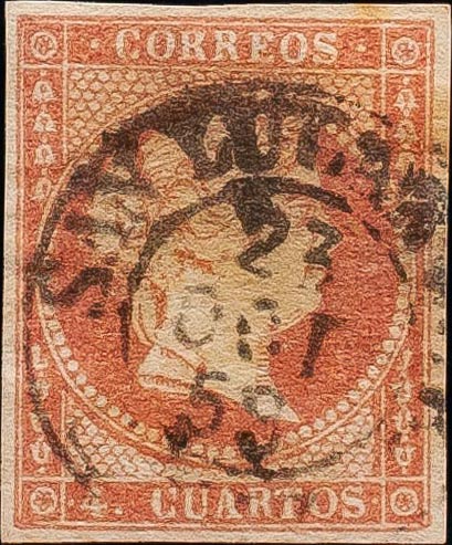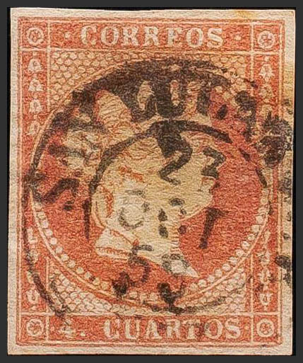 48. 1855. 4 cuartos red. Postmark SAN LUCAR DE B. / CADIZ (Type I). MAGNIFICENT AND RARE.