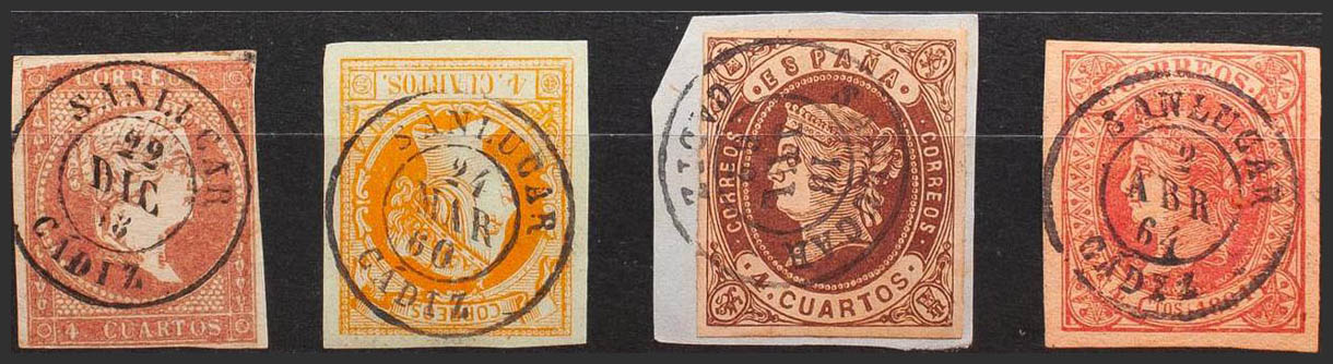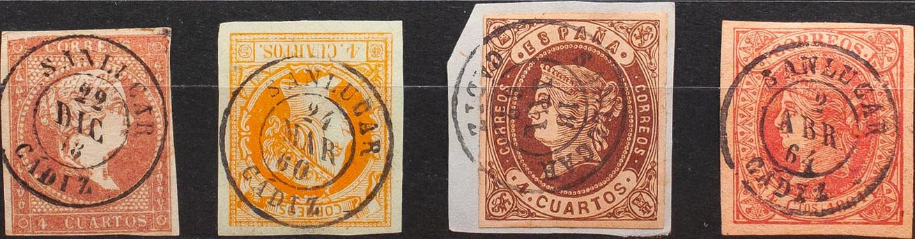 English 48, 52, 58, 64. (1855ca). Set of four 4- cuartos stamps red, yellow, brown and pink, unused with SANLUCAR / CADIZ postmark. MAGNIFICENT.