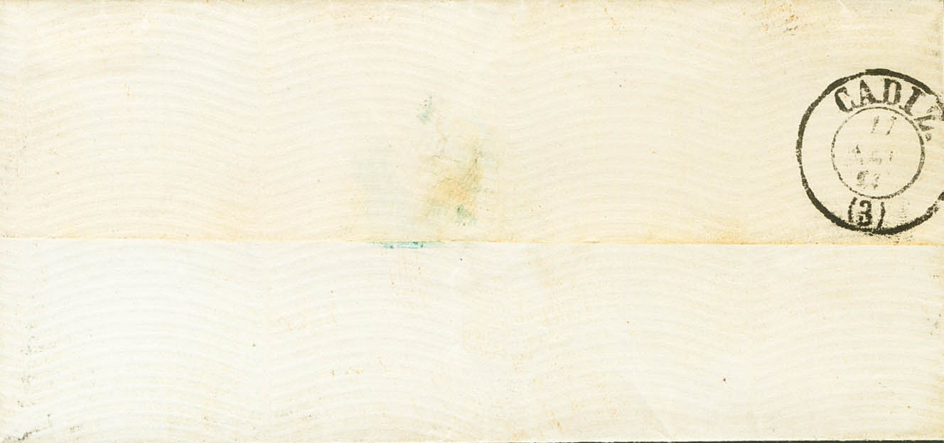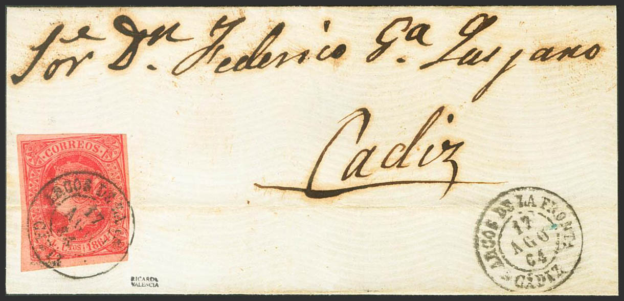 64. 1864. 4 pink cuartos . ARCHES OF THE FRONTERA to CADIZ. Postmark ARCOS DE LA FRONTª / CADIZ. MAGNIFICENT.