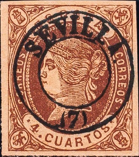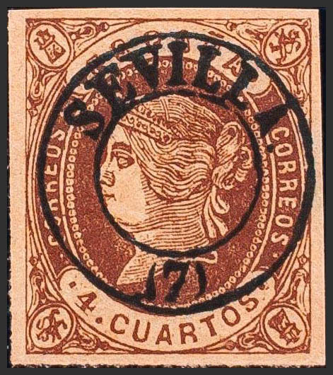 58. 1862. 4 cuartos chestnut. Postmark SEVILLE / (7). MAGNIFICENT.