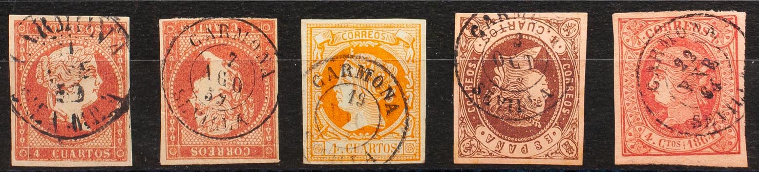 48(2), 52, 58, 64. (1855ca). Set of five 4- cuartos red, yellow, brown and pink stamps, unused with the CARMONA / SEVILLA postmark (including Type I on the 4- cuartos red). MAGNIFICENT.