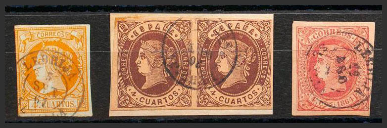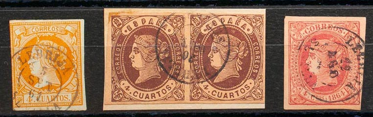52, 58(2), 64. (1860ca). Set of three 4- cuartos stamps yellow, brown (in a pair) and pink, unused with LEBRIJA / SEVILLA postmark. MAGNIFICENT.