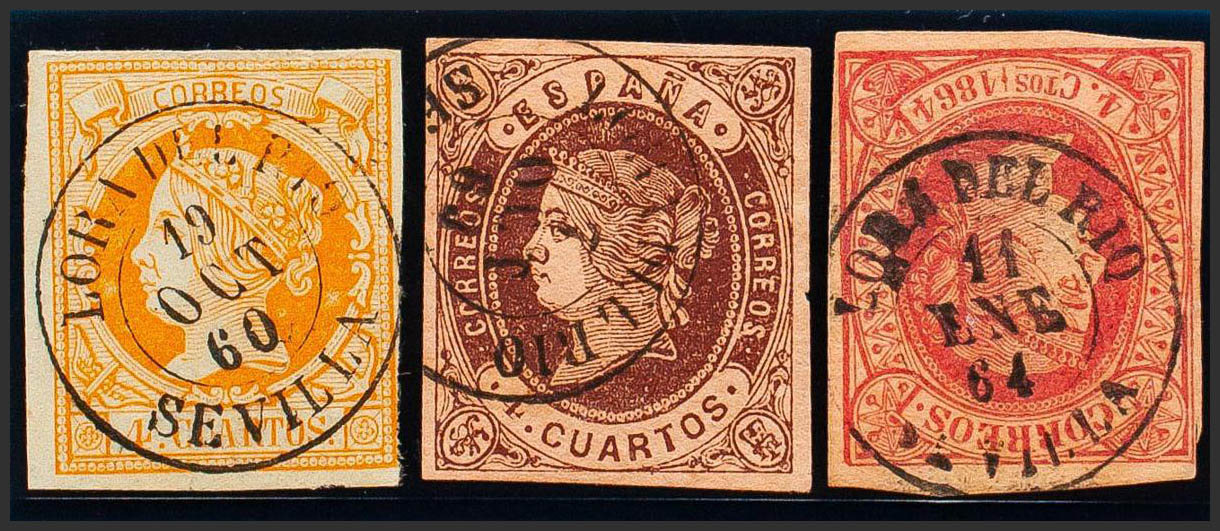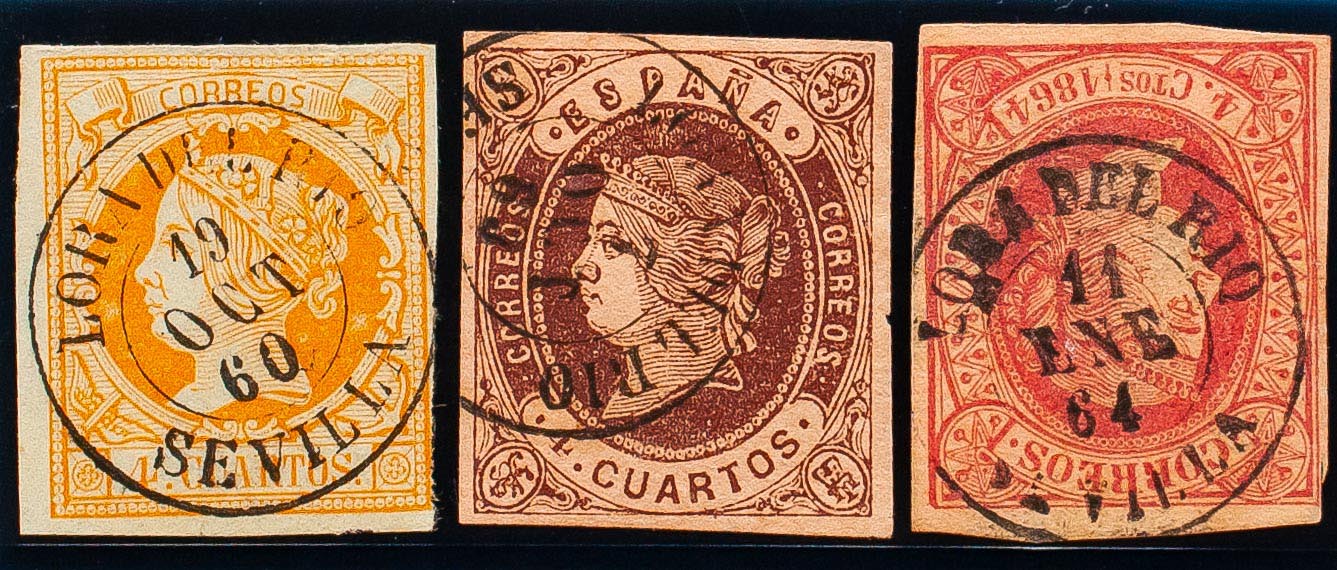 52, 58, 64. (1860ca). Set of three 4- cuartos yellow, brown and pink stamps, unused with the LORA DEL RIO / SEVILLA postmark. MAGNIFICENT.