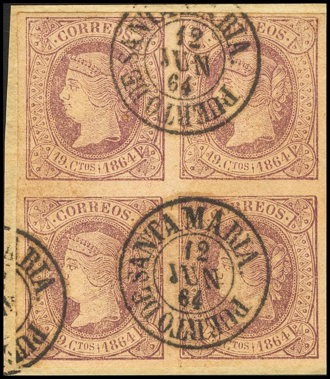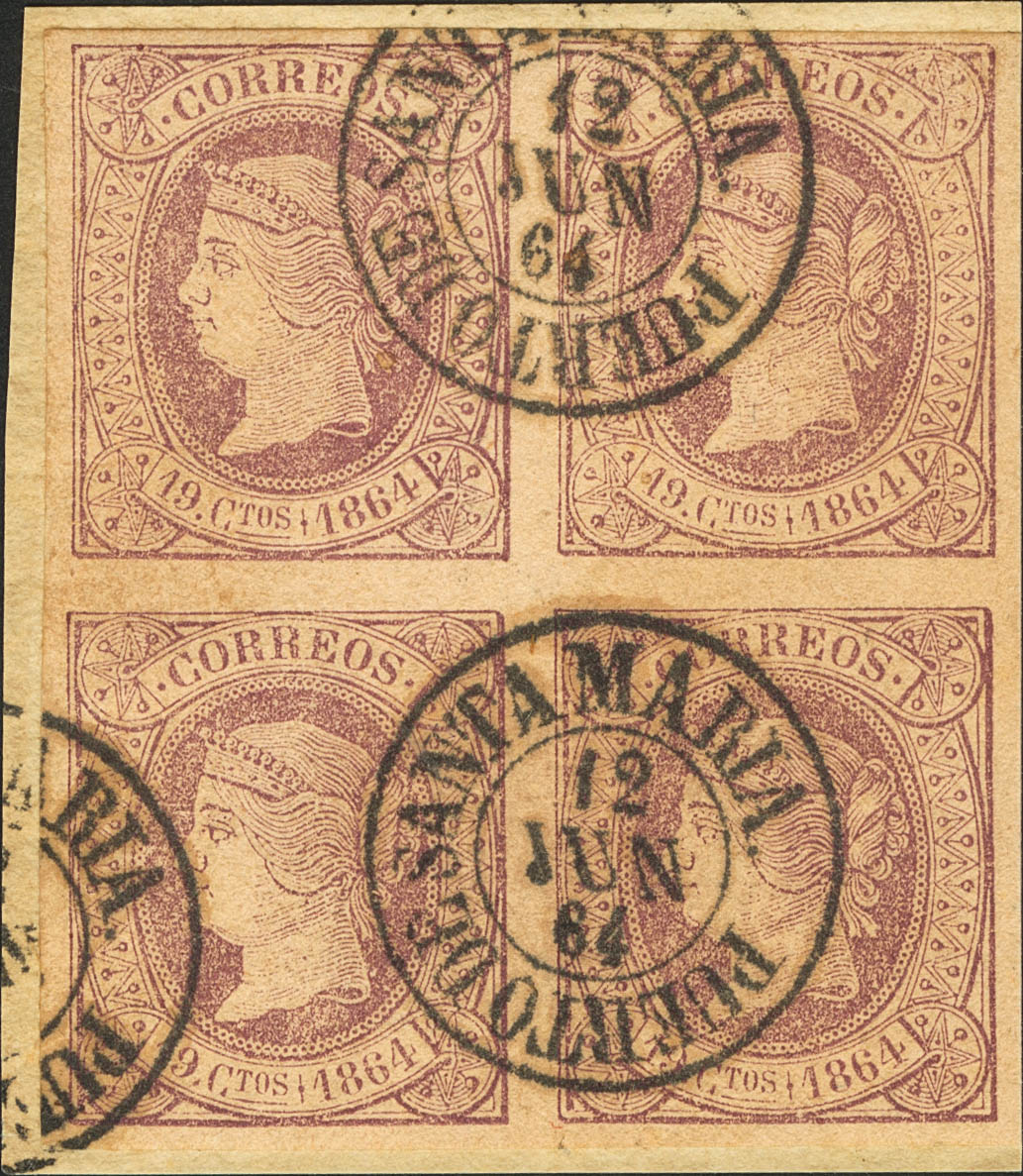 66(4). 1864. 19 violet quarters, block of four. Postmark of complacency PUERTO DE SANTA MARIA. MAGNIFICENT.