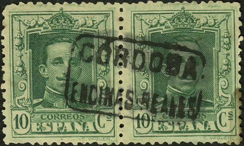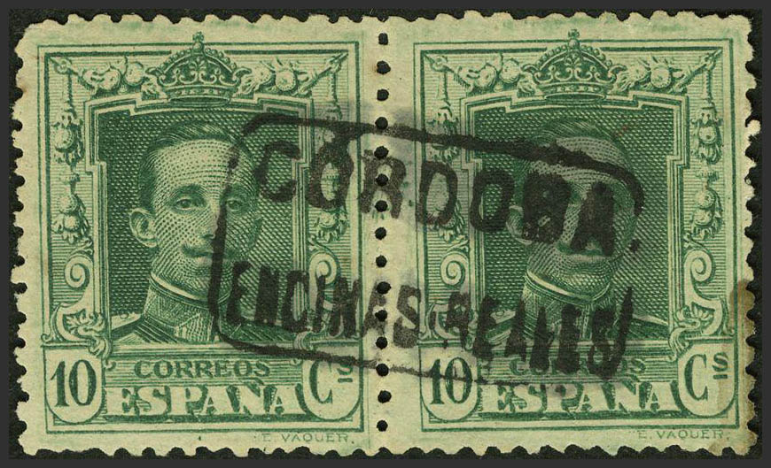 314(2). 1922. 10 cts green, pair. Mail postmark CORDOBA / ENCINAS-REALES. MAGNIFICENT.