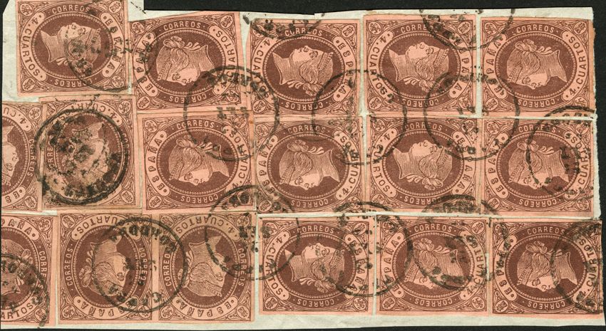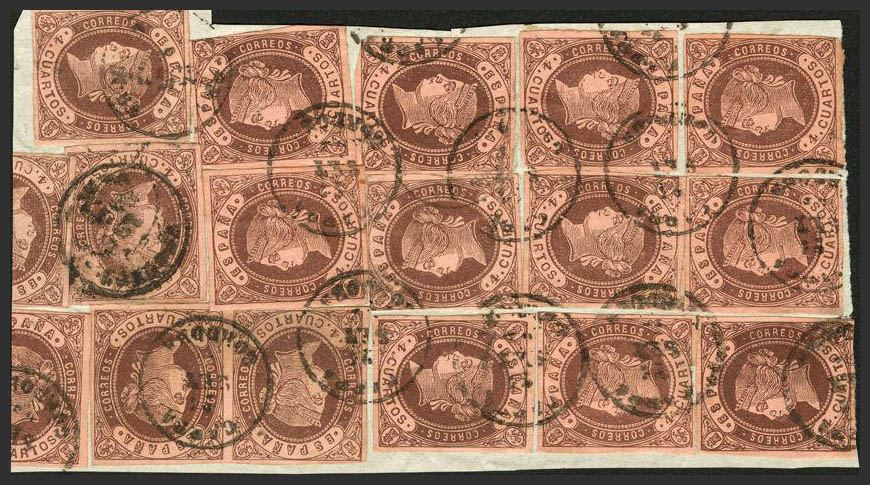 △ 58(16). 1862. 4 brown cuartos sixteen seals, on fragment. Postmark GOAT / CORDOBA. MAGNIFICENT.