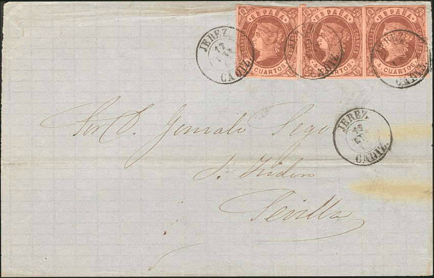 58(3). 1863. 4 chestnut cuartos , three stamps. Front from JEREZ to SEVILLE. Postmark JEREZ / CADIZ. RARE TRIPLE POSTAGE POSTAGE. LUXURY.