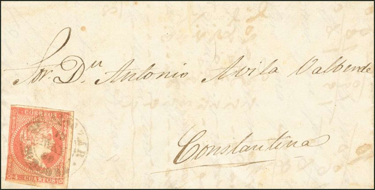48. 1859. 4 red cuartos . BELALCAZAR to CONSTANTINE. Postmark BELALCAZAR / CORDOBA, modified. RARE AND BEAUTIFUL.