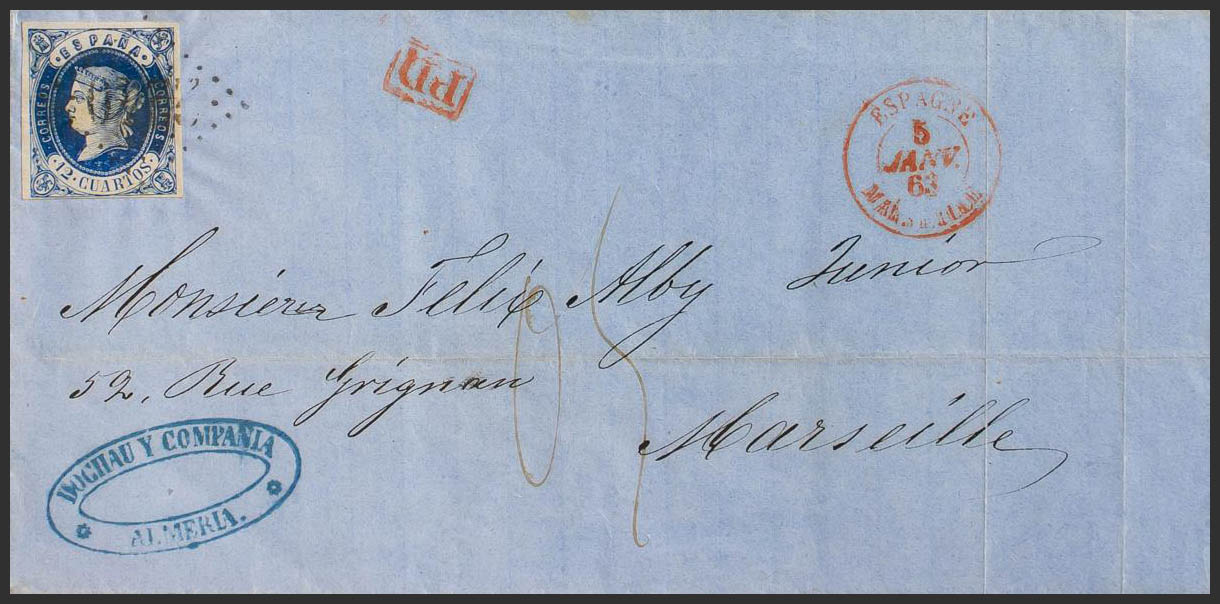 59. 1863. 12 cuartos blue. ALMERIA to MARSEILLE (FRANCE). Postmark RHOMBUS OF POINTS Nº2240, upon arrival. MAGNIFICENT AND SPECTACULAR, RARE.