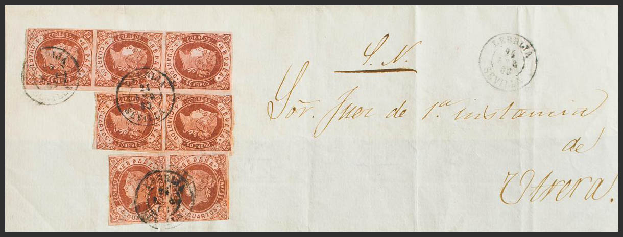 58(7). 1863. 4 chestnut cuartos , seven stamps. Judicial Escrow from LEBRIJA to UTRERA. Postmark LEBRIJA / SEVILLE. MAGNIFICENT AND RARE.