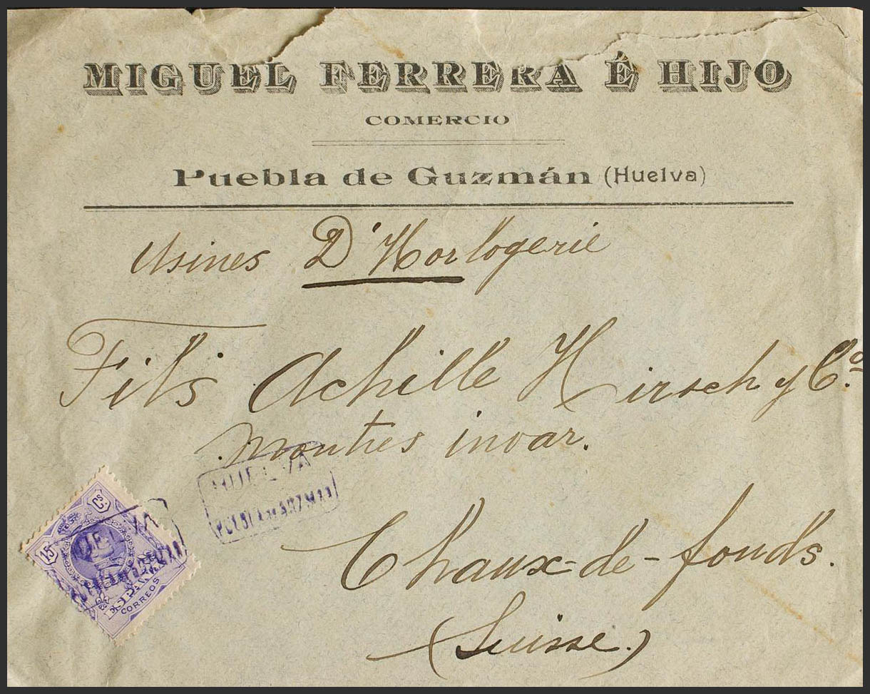 270. 1912. 15 cts Violet. PUEBLA DE GUZMAN to CHAUX DE FONDS (SWITZERLAND). Letter case HUELVA / PUEBLA DE GUZMAN, in blue. MAGNIFICENT AND RARE.