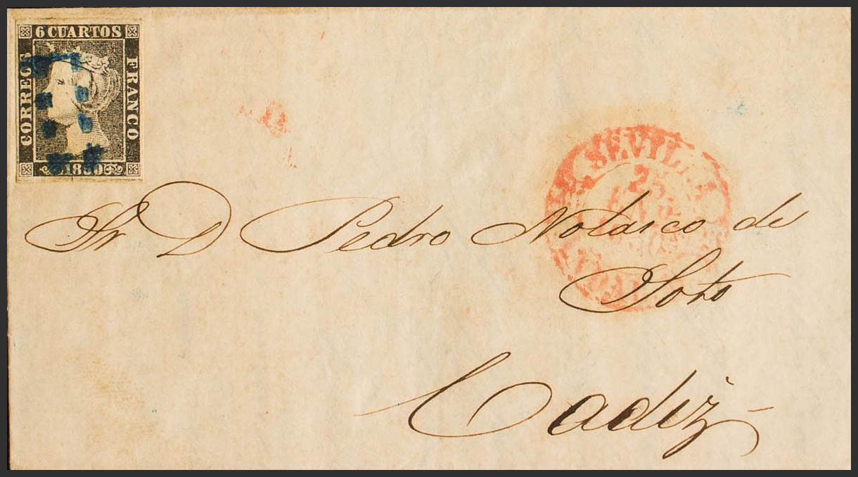 1. 1850. 6 cuartos black. SEVILLE to CADIZ. Pre-philatelic postmark "11" filed, from Sevilla. MAGNIFICENT.