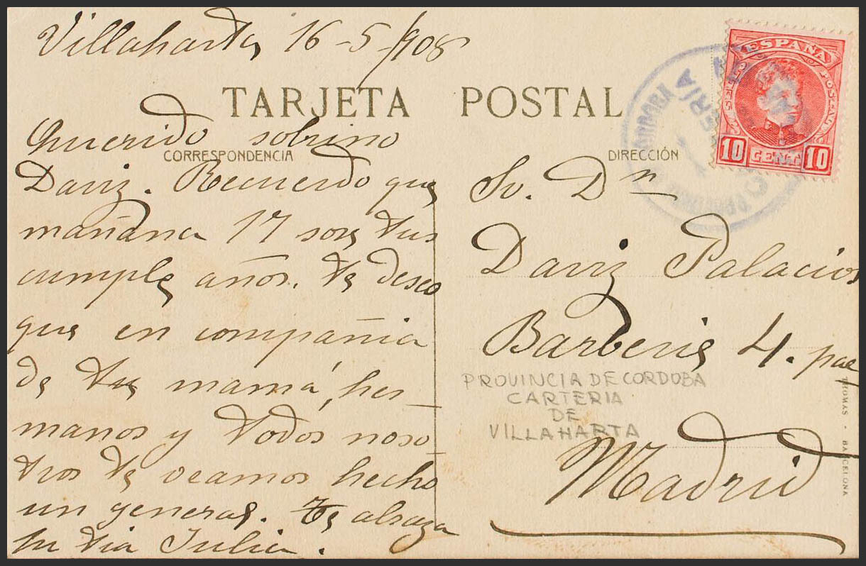 243. 1908. 10 cts red. VILLAHARTA (CORDOBA) to CORDOBA. Postmark PROVINCE OF CORDOBA / CARTERIA DE / VILLAHARTA, in blue. MAGNIFICENT AND RARE.