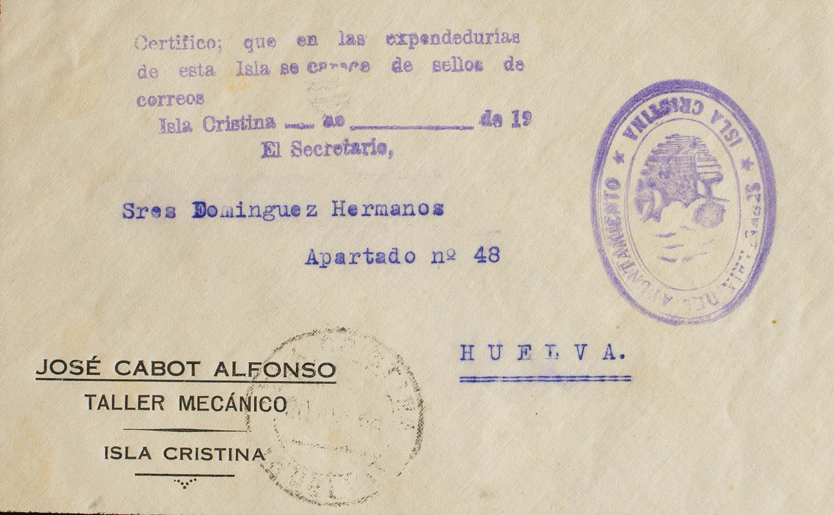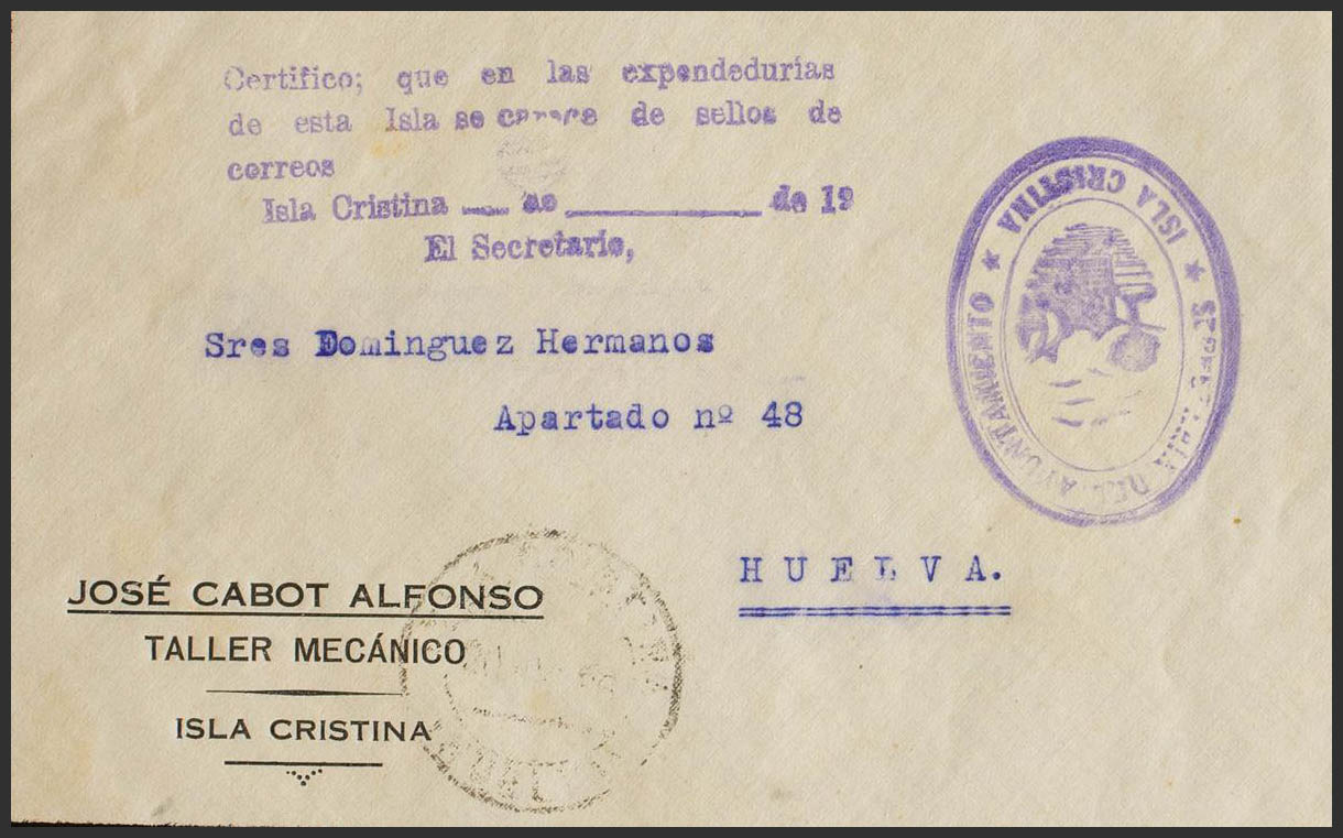1936. CRISTINA ISLAND to HUELVA. Marks SECRETARY OF THE CITY COUNCIL / ISLA CRISTINA, in purple and "I certify: that there are no postage stamps in the outlets on this island. Isla Cristina". MAGNIFICENT AND RARE.