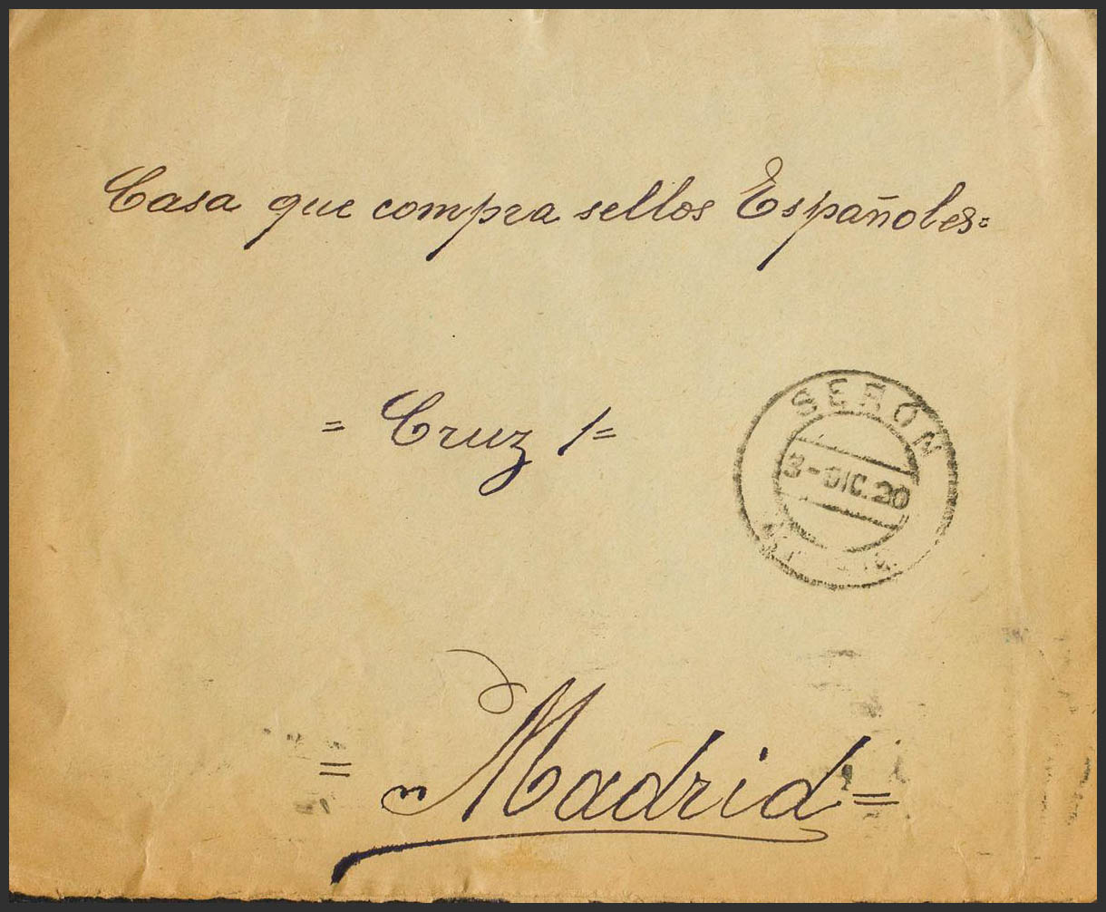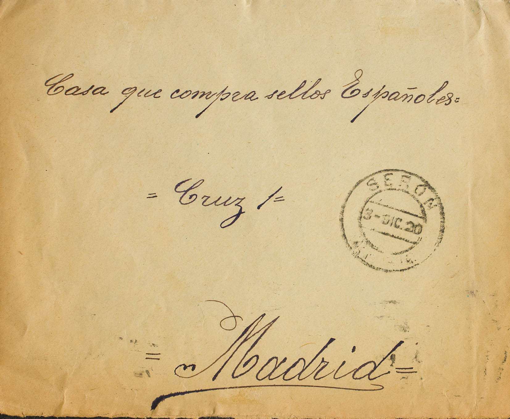 1920. SERON (ALMERIA) to MADRID. Addressed to "House that buys Spanish stamps, Cruz, 1" and on the back handwritten "I certify: that there are no postage stamps in these outlets. Serón, December 3, 1920" and town hall mark, in purple. MAGNIFICENT AND RARE.