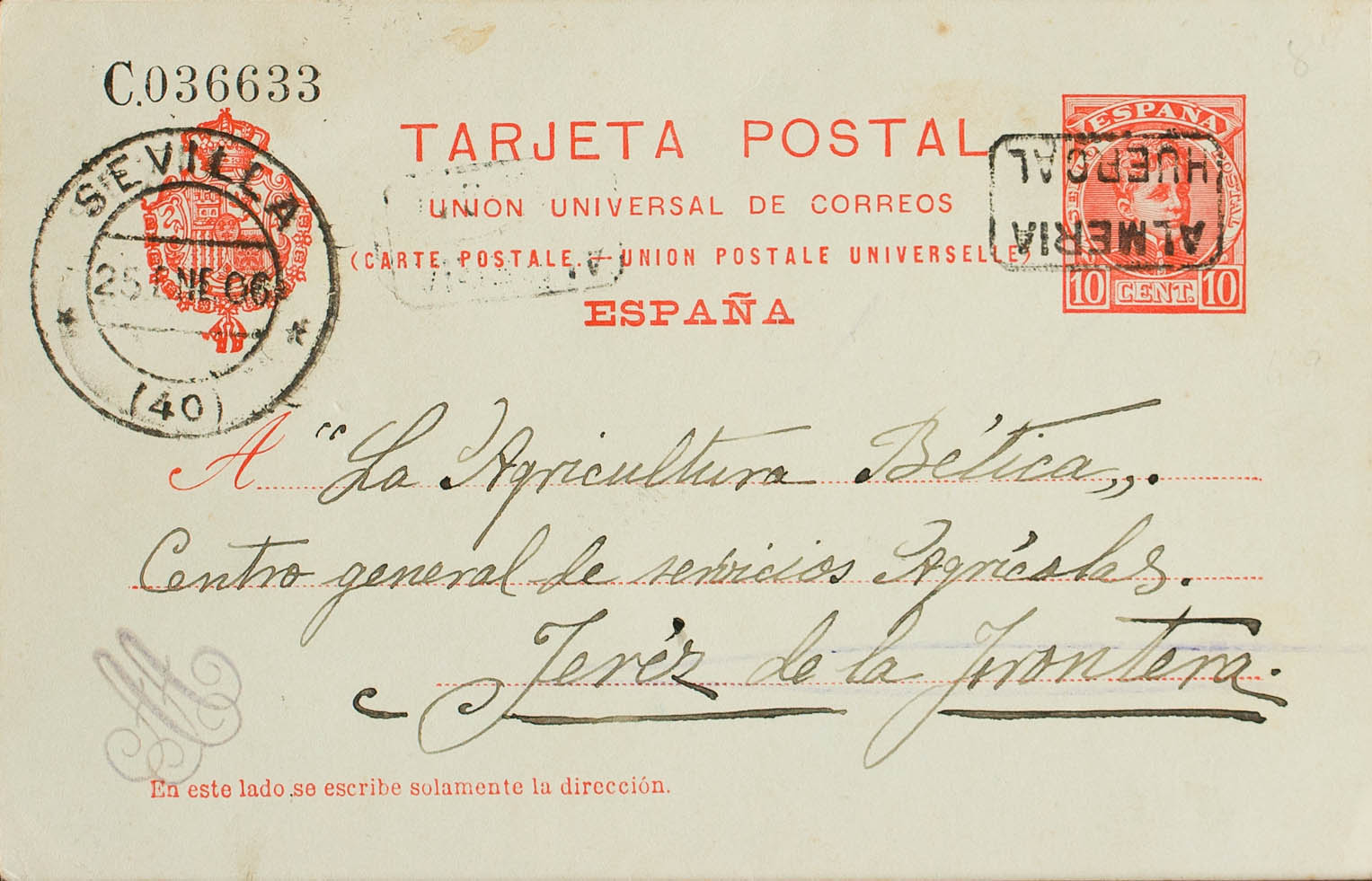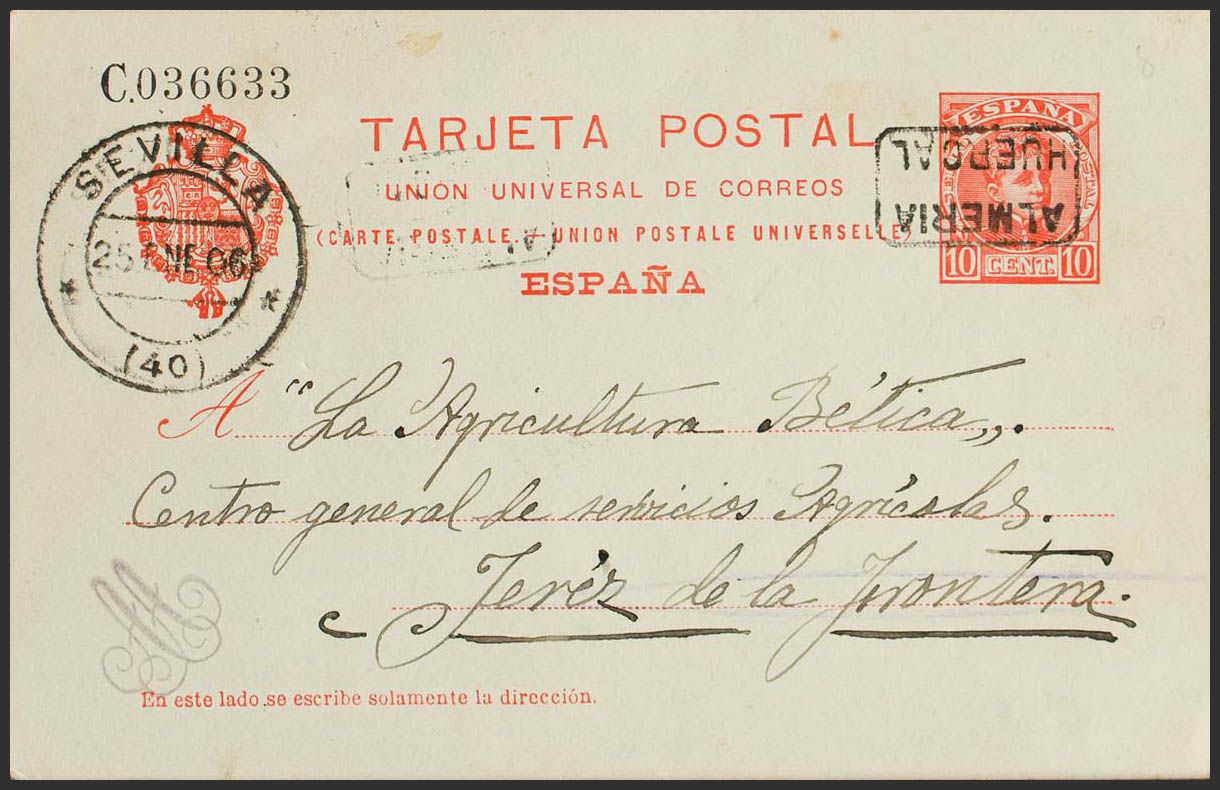 EP47. 1906. 10 cts red envelope Card Entire Post Card from PECHINA to JEREZ DE LA FRONTERA. Mail postmark ALMERIA / HUERCAL. MAGNIFICENT.