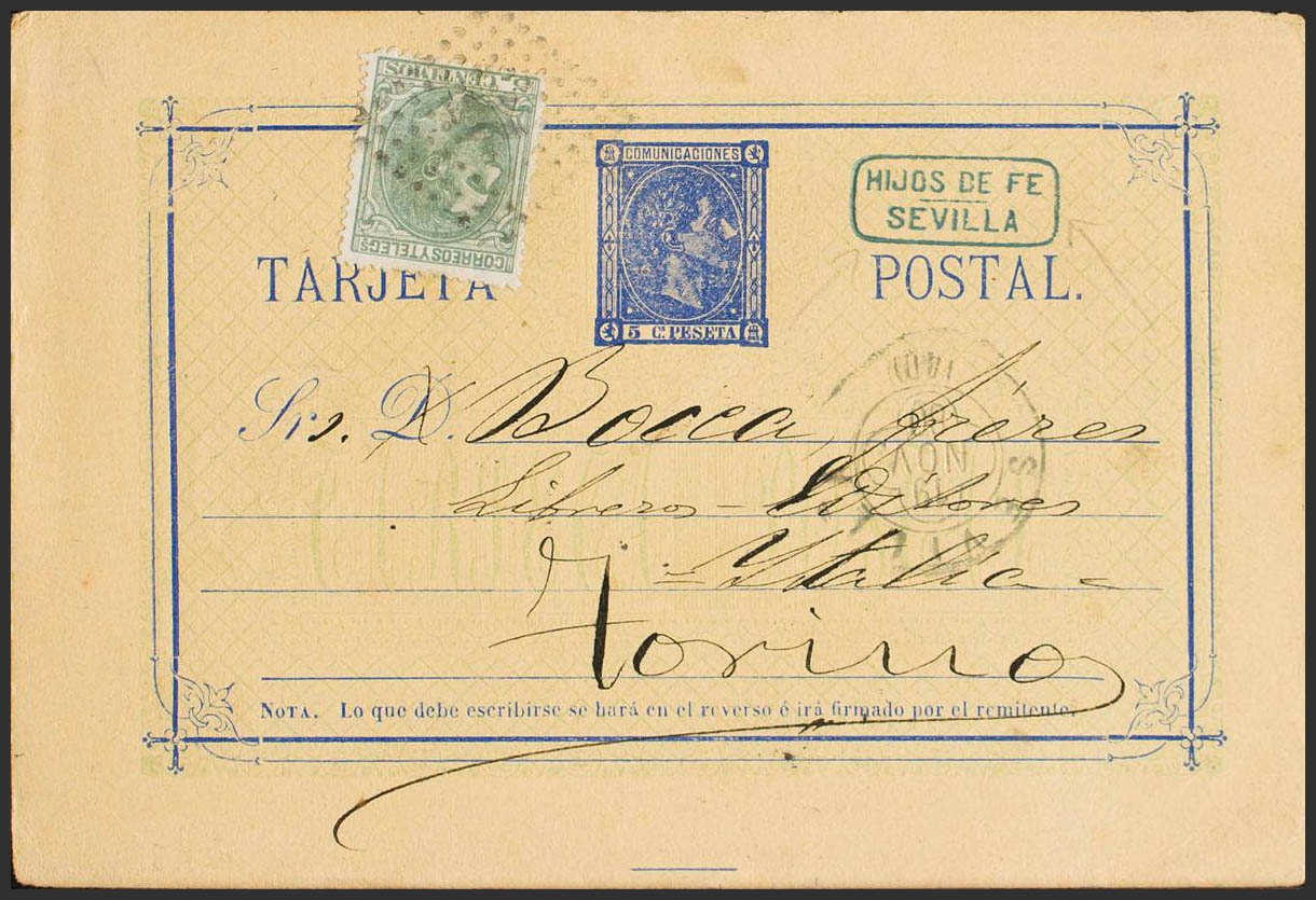 EP8, 201. 1880. 5 cts overseas on Entire Post Card from SEVILLE to TURIN (ITALY), with complementary postage of 5 green cts. On the back transit. MAGNIFICENT.
