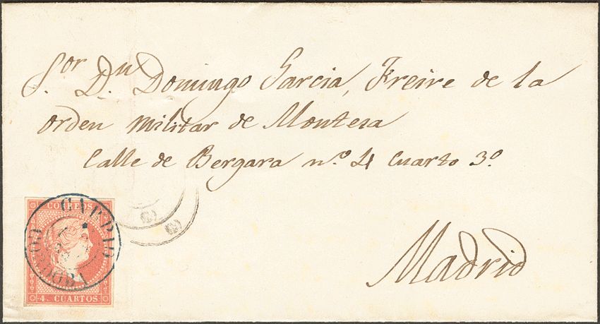 48. 1856. 4 red cuartos . CARPIO to MADRID. Postmark CARPIO / CORDOBA (Type I), in blue. MAGNIFICENT.