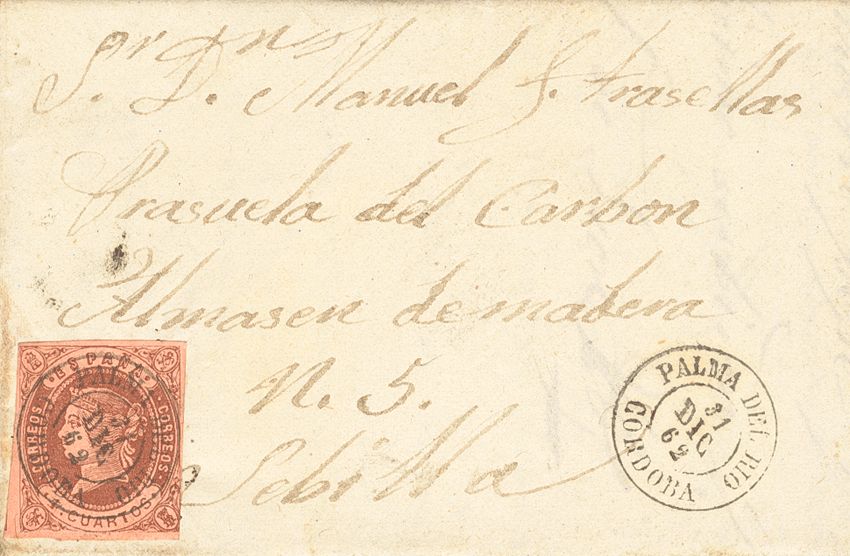 62. 1862. 4- cuartos chestnut. PALMA DE RIO to SEVILLE. Postmark PALMA DE RIO / CORDOBA. MAGNIFICENT.