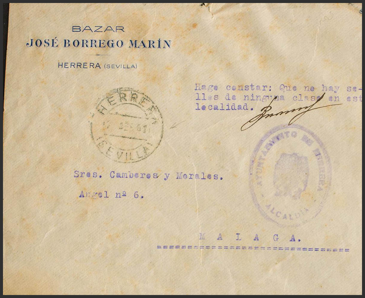 1941. HERRERA (SEVILLE) to MALAGA. Brand TOWN HALL OF HERRERA / ALCALDIA, in violet and typed text "I hereby state: that there are no stamps of any kind in this locality", advertising MARIN OLIVE OILS ARE THE BEST on the back. MAGNIFICENT.