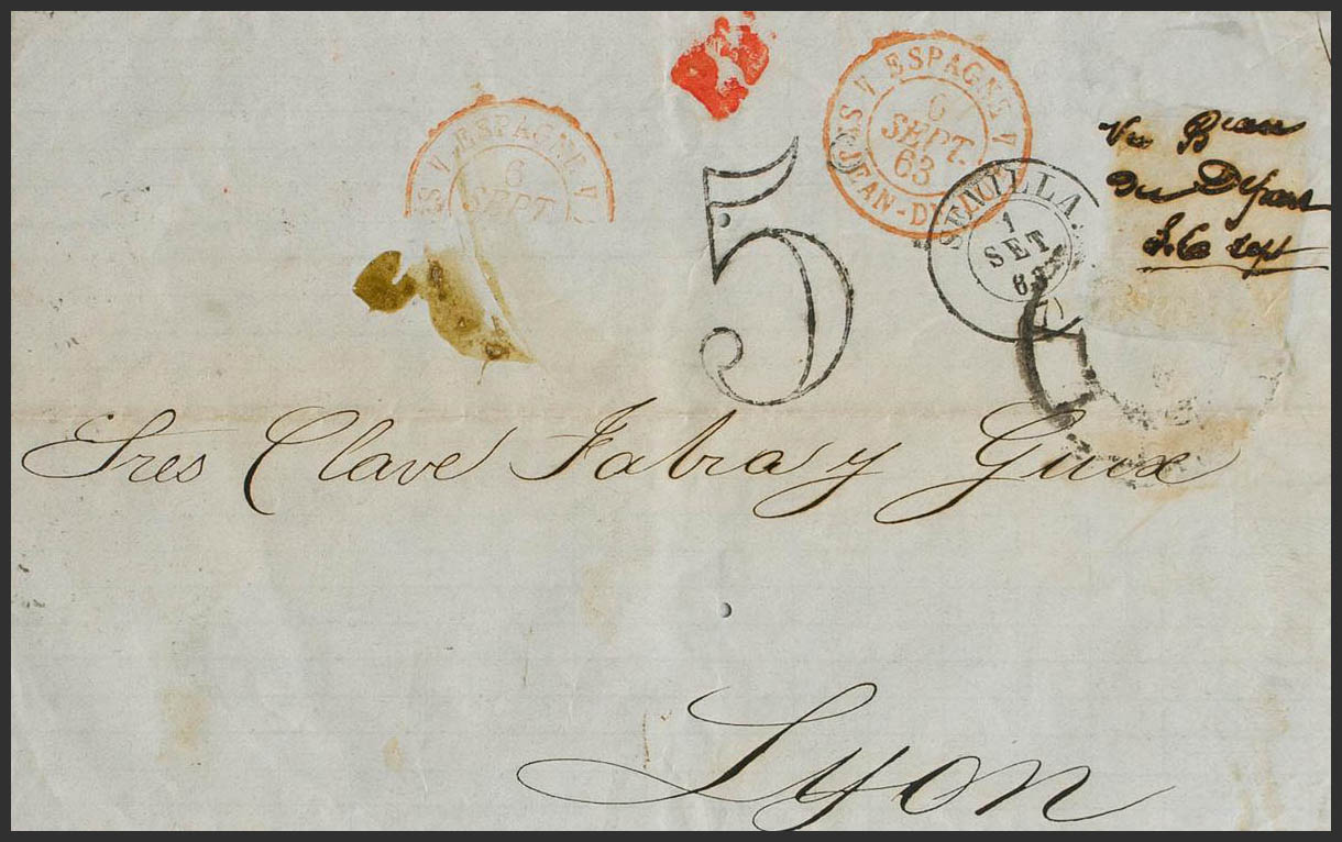1863. SEVILLE to LYON (FRANCE). Seal detached during the journey and in its place, handwritten annotation "Vu Beau, du Defau, le 6 sept" (we understand that it means "approval to the lack of the seal"). MAGNIFICENT AND VERY RARE, WE DO NOT KNOW ANOTHER SIMILAR.