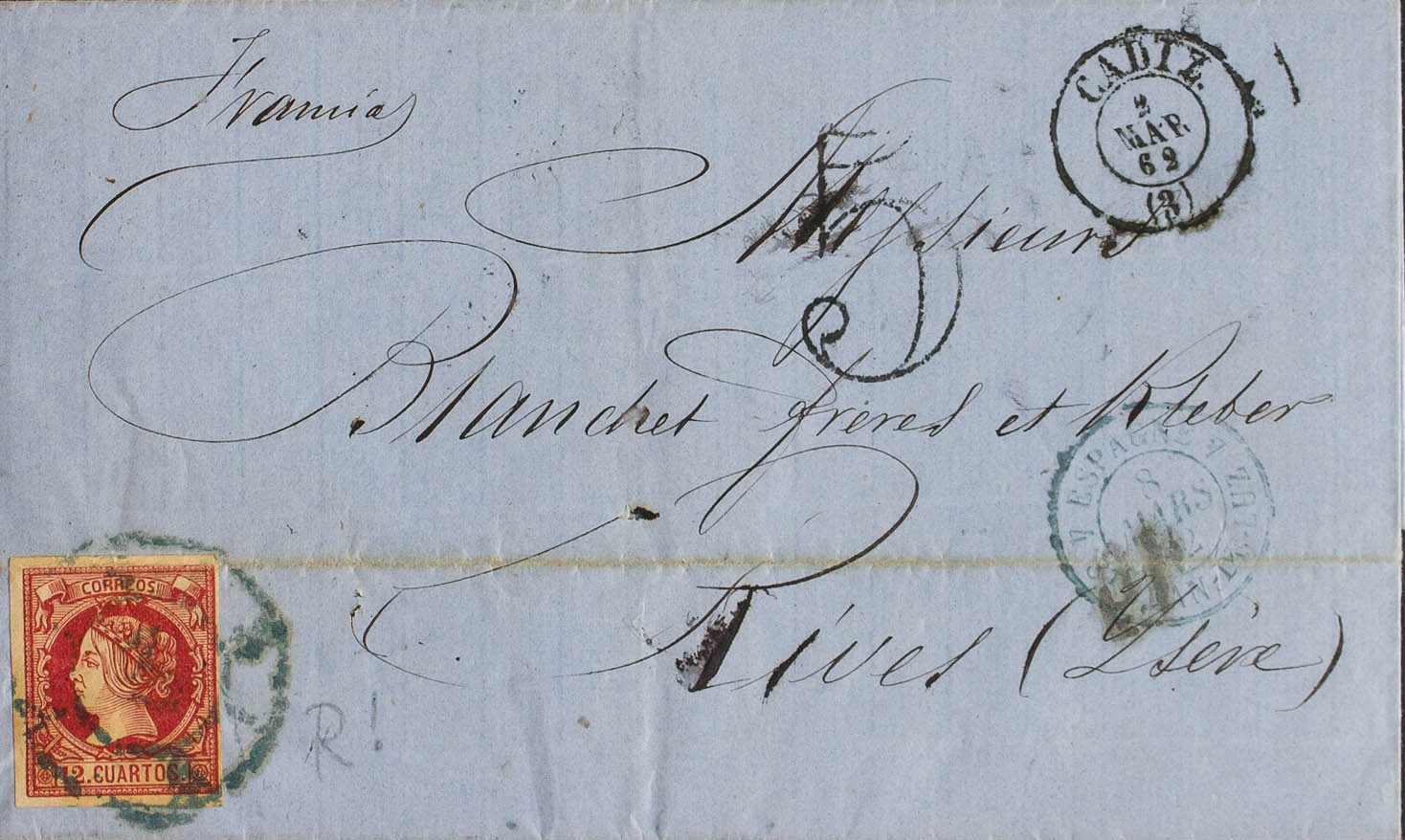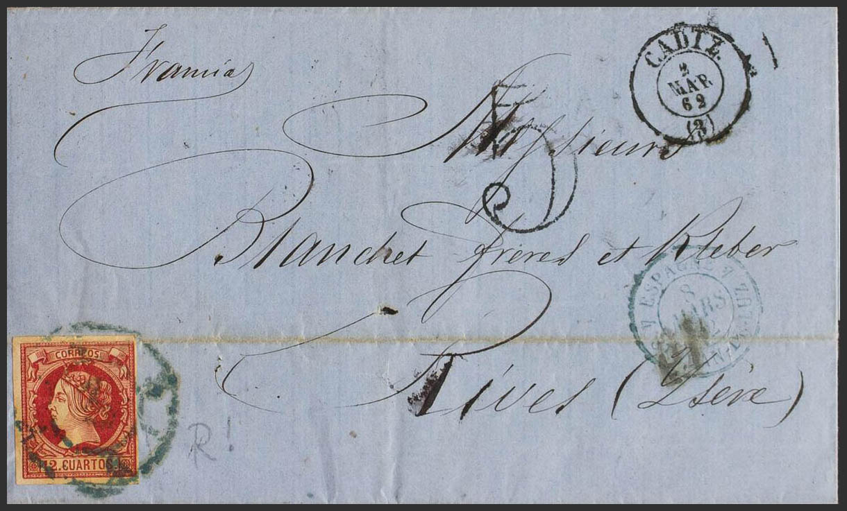 53. 1862. 12 cuartos carmine. CADIZ to RIVES (FRANCE). Postmark R. CARRETA Nº3, in blue. MAGNIFICENT AND RARE.