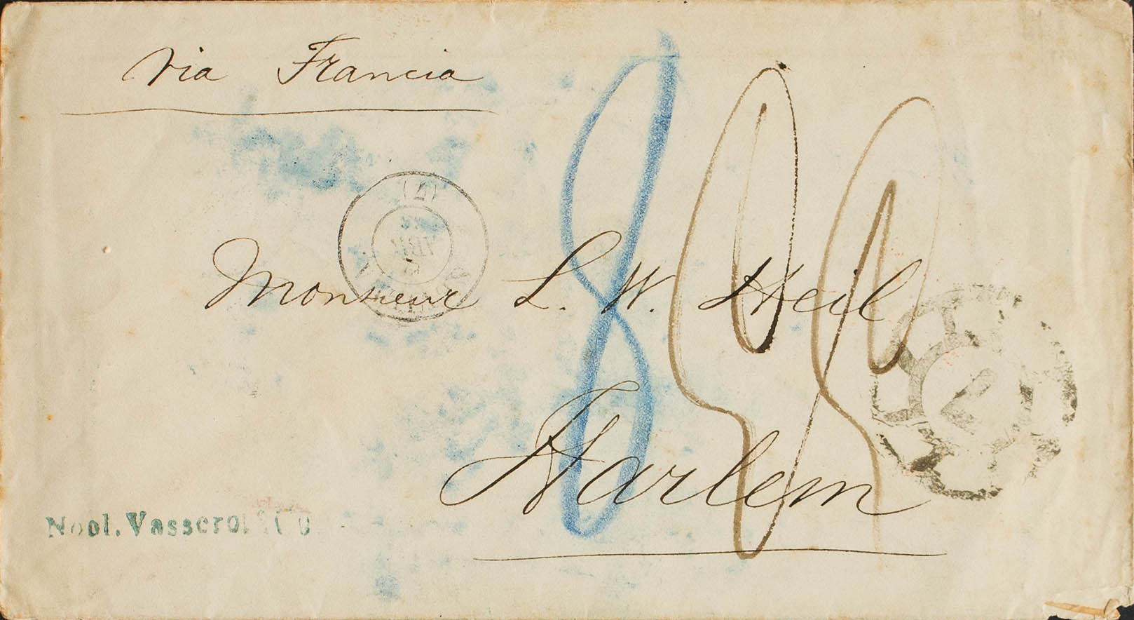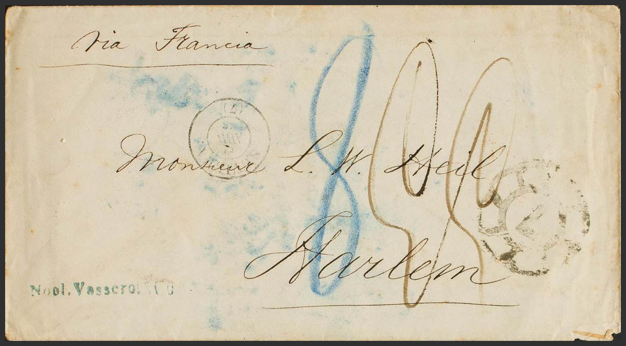 1865. SEVILLE to HARLEM (HOLLAND). Mark R.CARRETA Nº7, used to indicate that the letter circulated free, abroad the franchise is not accepted and is charged with various handwritten postage. MAGNIFICENT AND RARE.