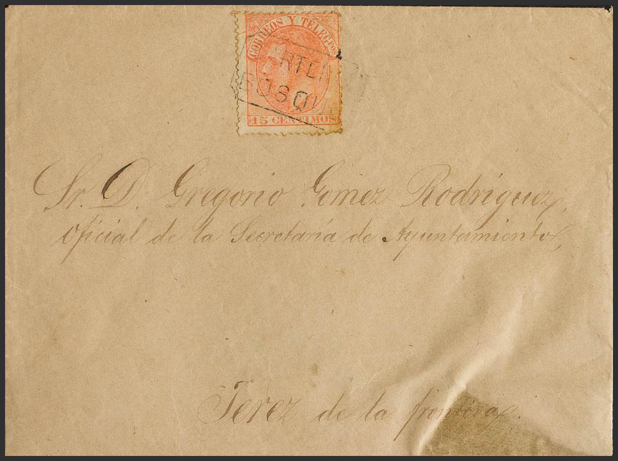 210. 1885. 15 cts yellow. THE FOREST (CADIZ) to JEREZ DE LA FRONTERA. Postmark CARTERIA / FOREST. MAGNIFICENT.