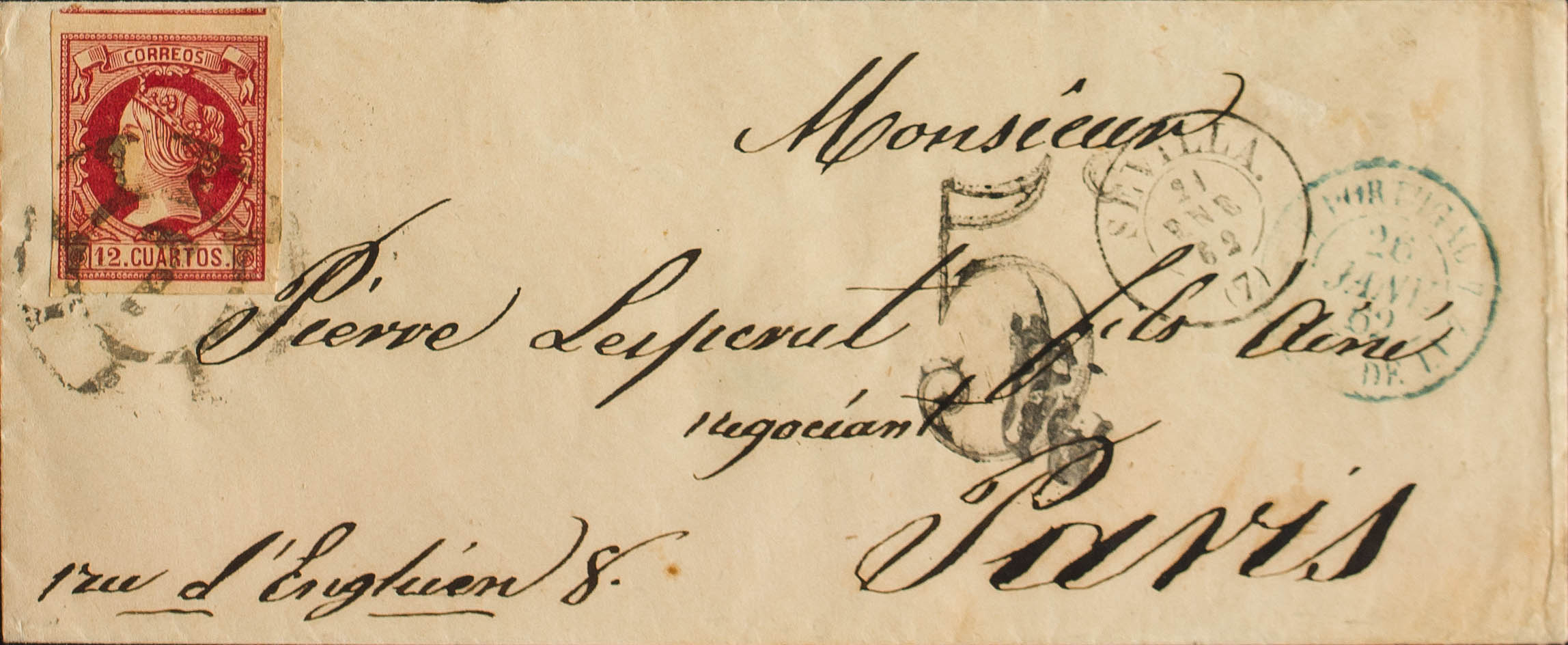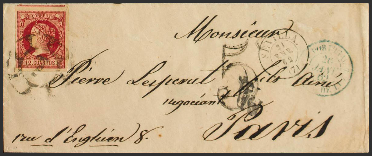 53. 1862. 12 cuartos carmine. SEVILLE to PARIS. Postmark R.CARRETA Nº7, on the front French entry date PORTUGAL / S. JEAN DE LUZ, in blue wrongly applied, and only used for letters from Portugal. MAGNIFICENT AND VERY RARE.