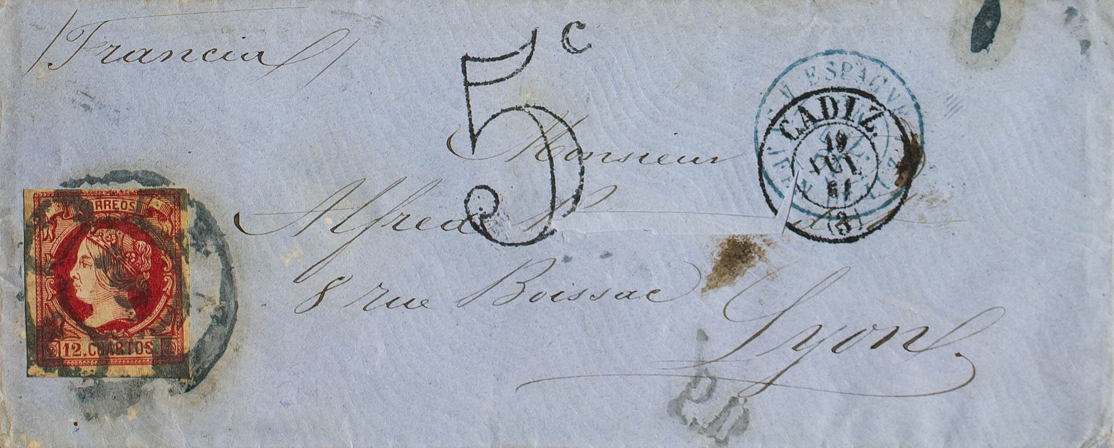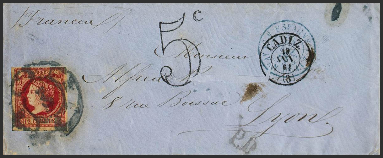 53. 1861. 12 cuartos carmine. CADIZ to LYON (FRANCE). Postmark R. CARRETA Nº3, in blue. MAGNIFICENT AND RARE.