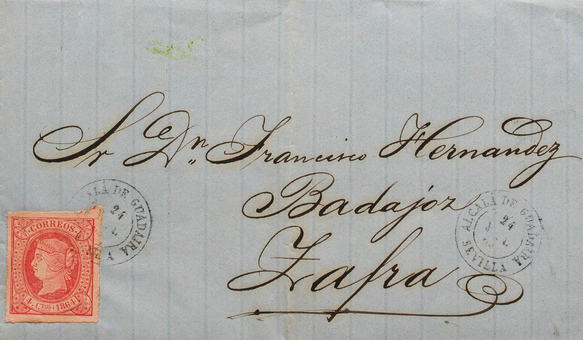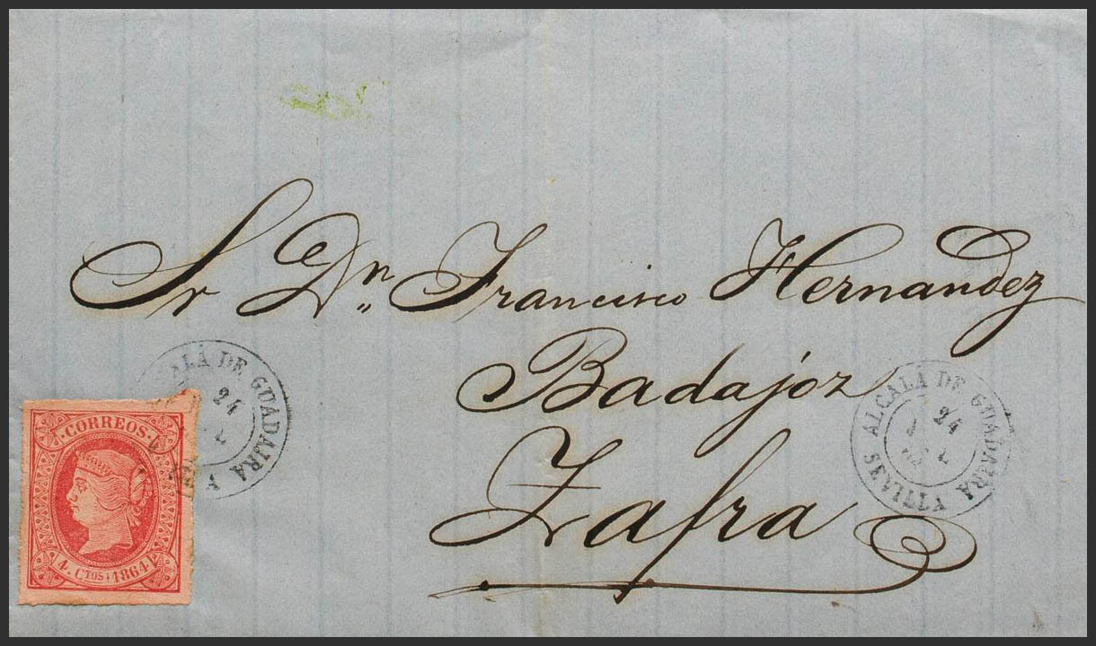 64. 1864. 4 red cuartos . ALCALA DE GUADAIRA to ZAFRA. Postmark ALCALA DE GUADAIRA / SEVILLE. MAGNIFICENT.