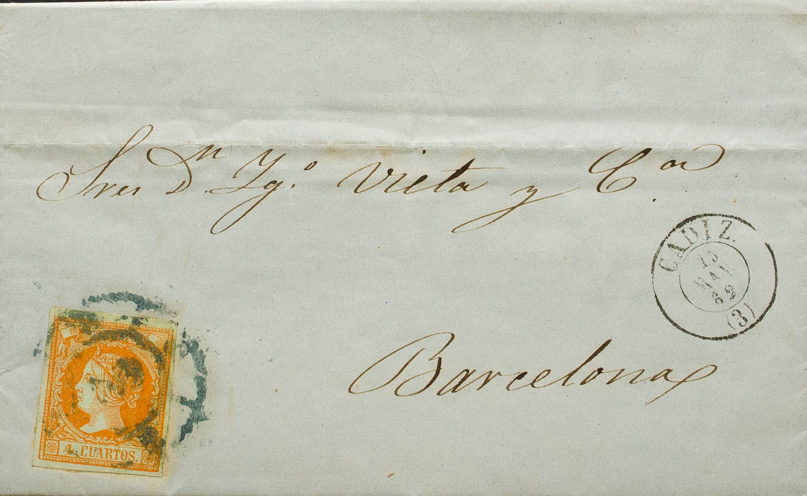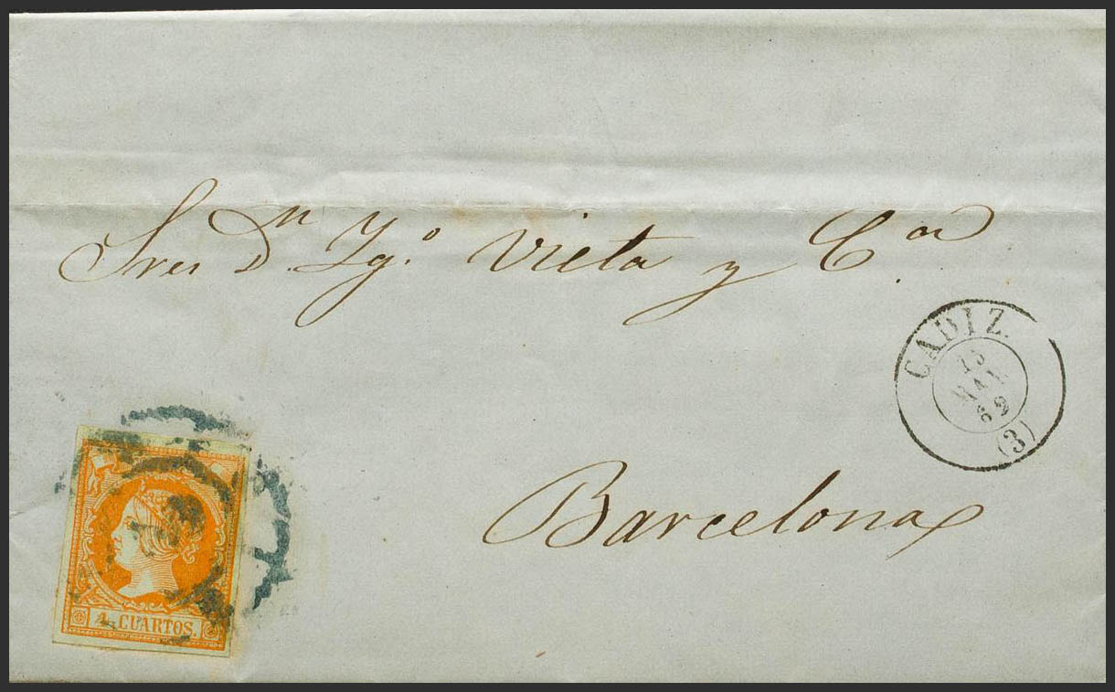 52. 1860. 4 orange cuartos . CADIZ to BARCELONA. Postmark R. CARRETA Nº3, in blue. MAGNIFICENT AND RARE.