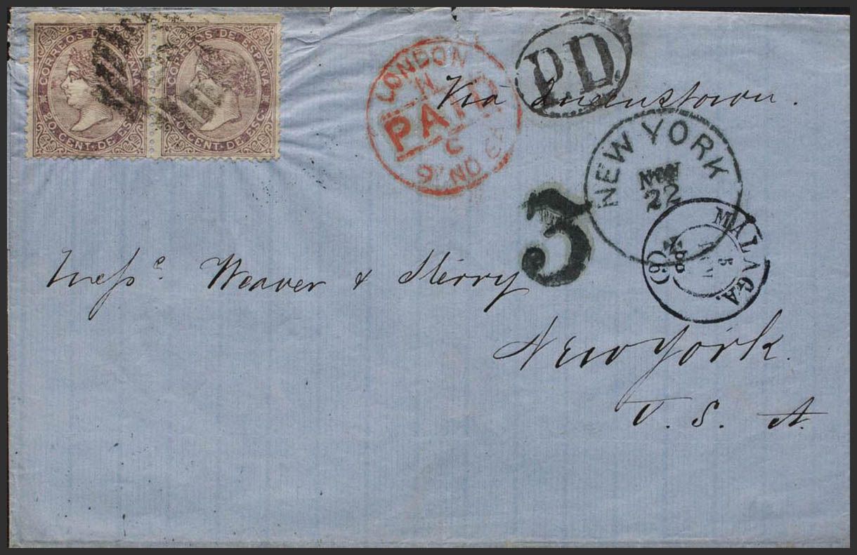 92(2). 1867. 20 cts lilac, pair. MALAGA to NEW YORK (USA). Simple postage. MAGNIFICENT.