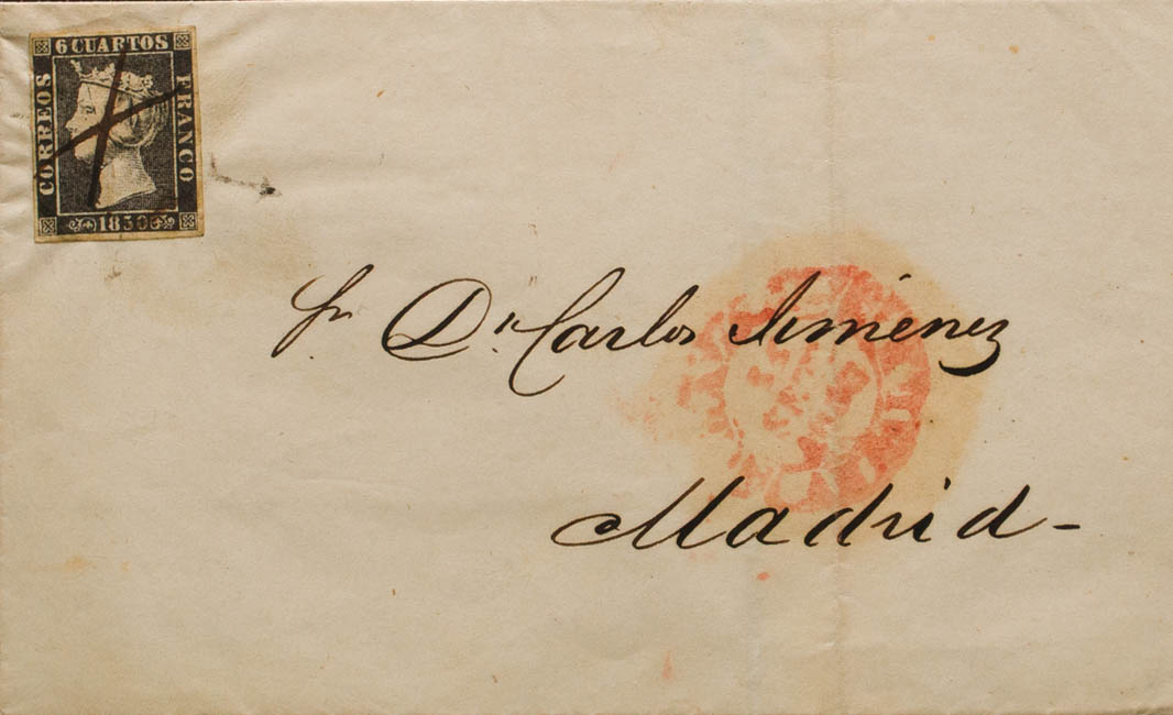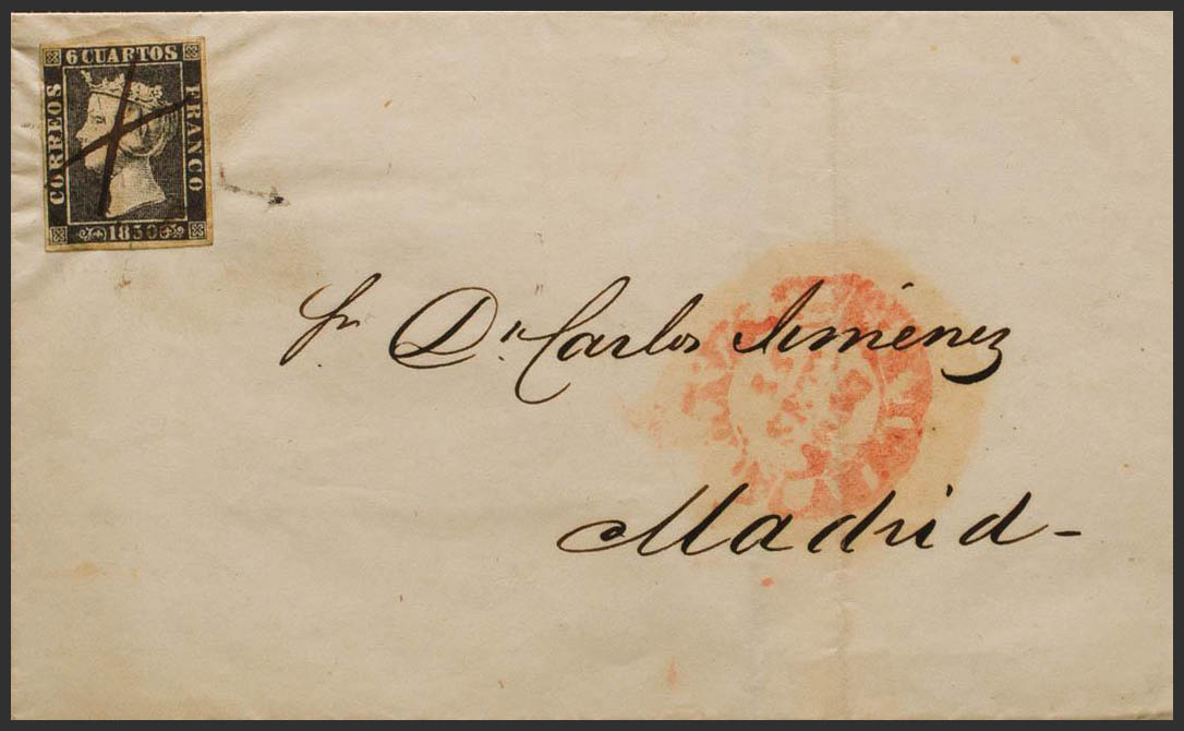 1A. 1850. 6- cuartos black. MALAGA to MADRID. SPIDER postmark, weakly stamped, so it is canceled by pen upon arrival to ensure that the stamp was conveniently unused. MAGNIFICENT AND RARE.