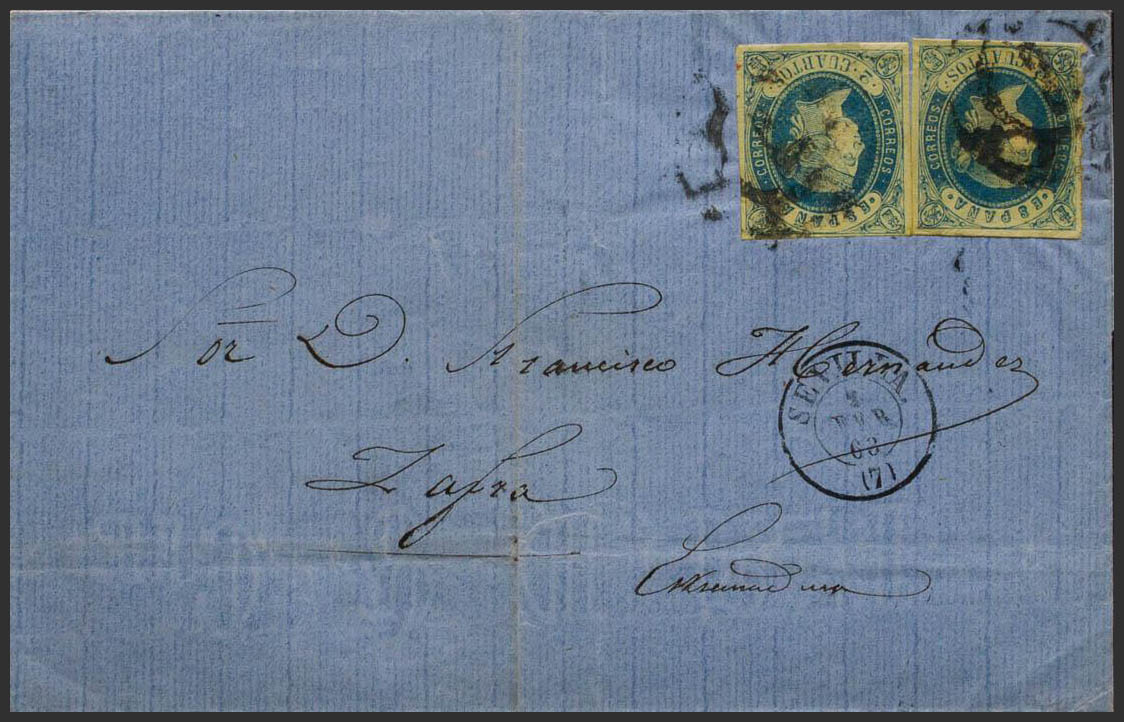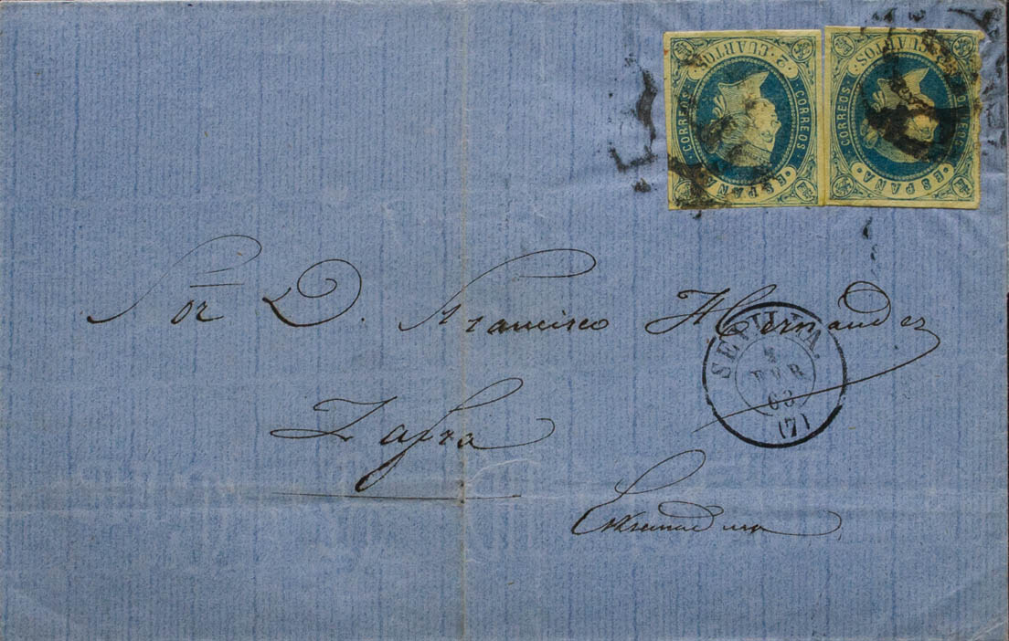 57(2). 1863. 2 blue cuartos , two stamps. SEVILLE to ZAFRA. MAGNIFICENT AND RARE COMBINATION OF POSTAGE TO COMPLETE THE RATE OF 4 ROOMS.