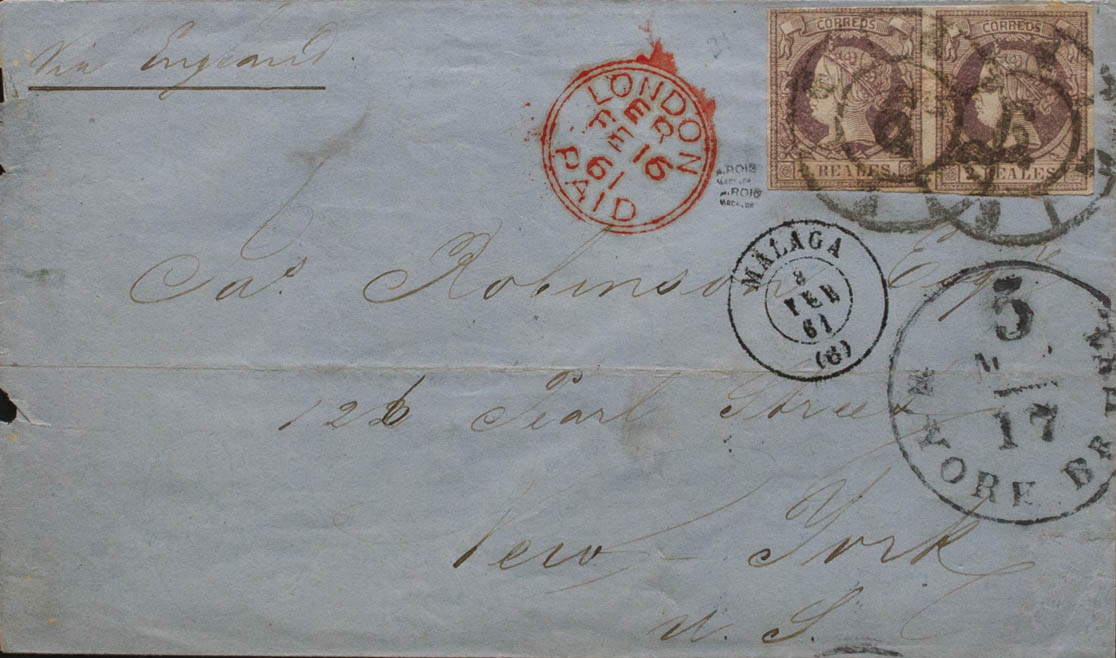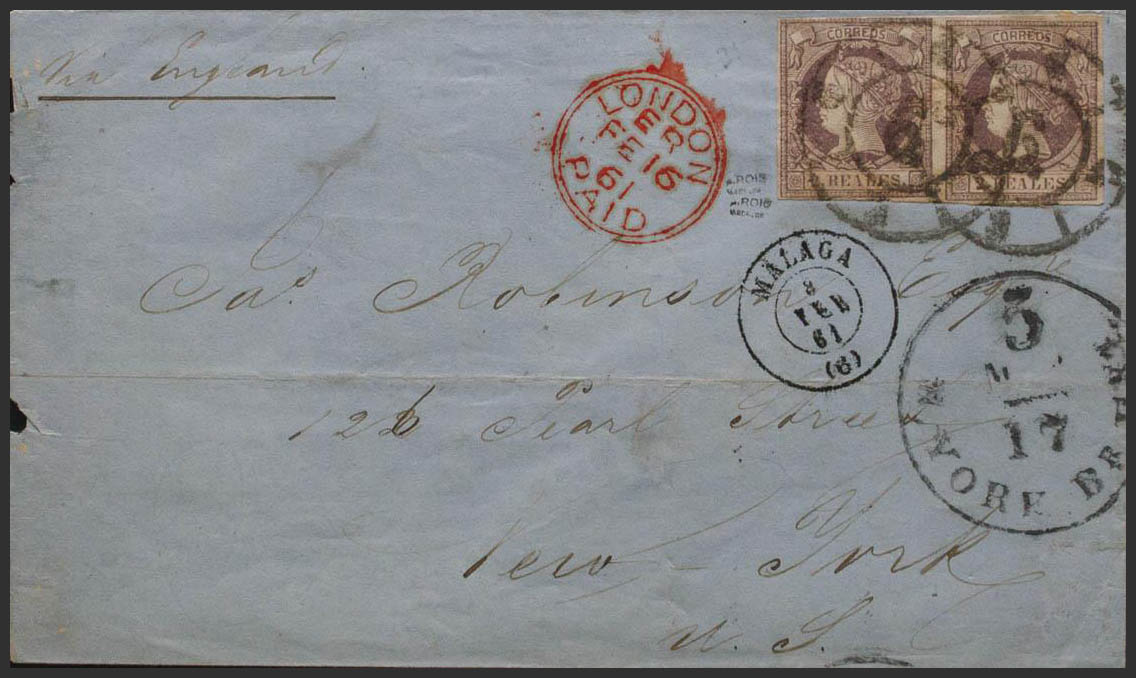 56(2). 1861. 2 lilac reales , pair. MALAGA to NEW YORK (USA). Simple postage via England. MAGNIFICENT.