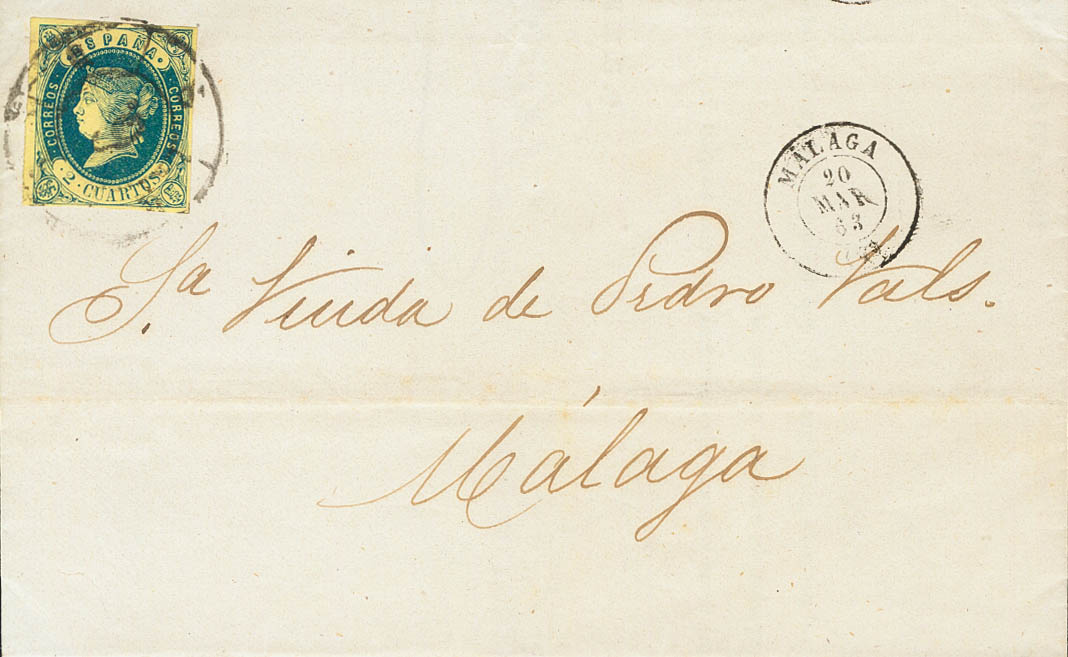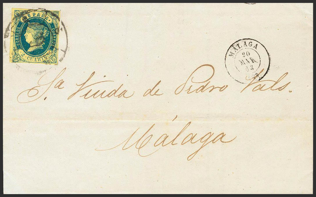 57. 1863. 2 cuartos blue. Internal Mail of MALAGA. Postmark R. CARRETA Nº6. MAGNIFICENT.