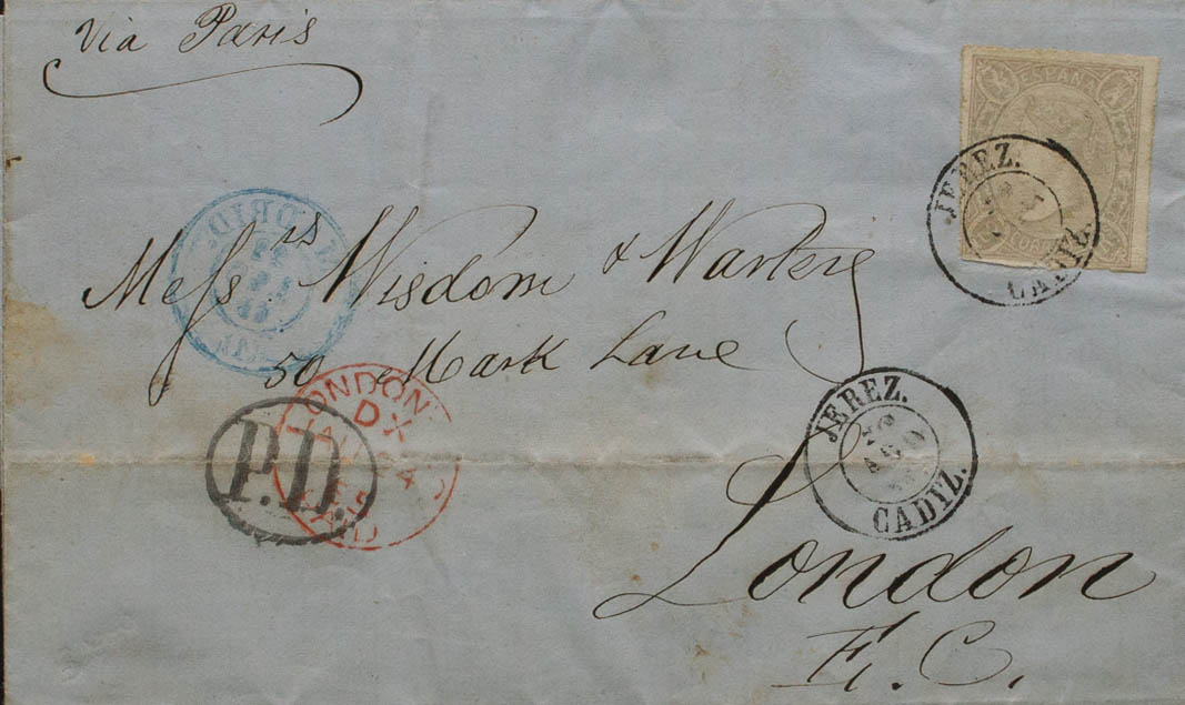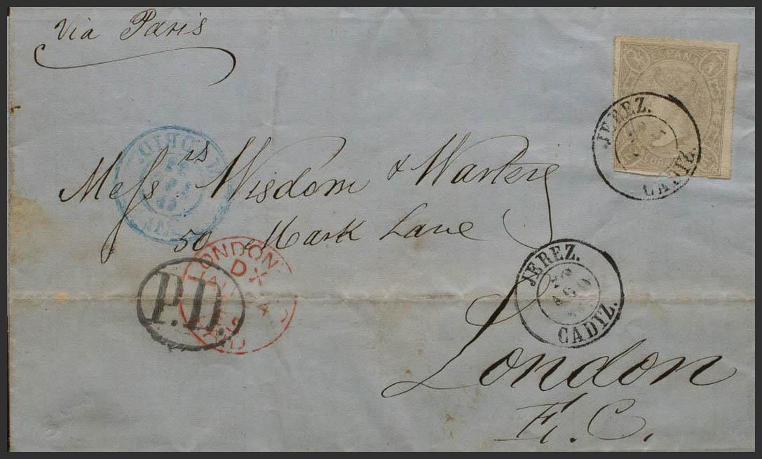 73. 1865. 2 reales gray lilac. JEREZ DE LA FRONTERA to LONDON (ENGLAND). Postmark JEREZ / CADIZ. MAGNIFICENT.