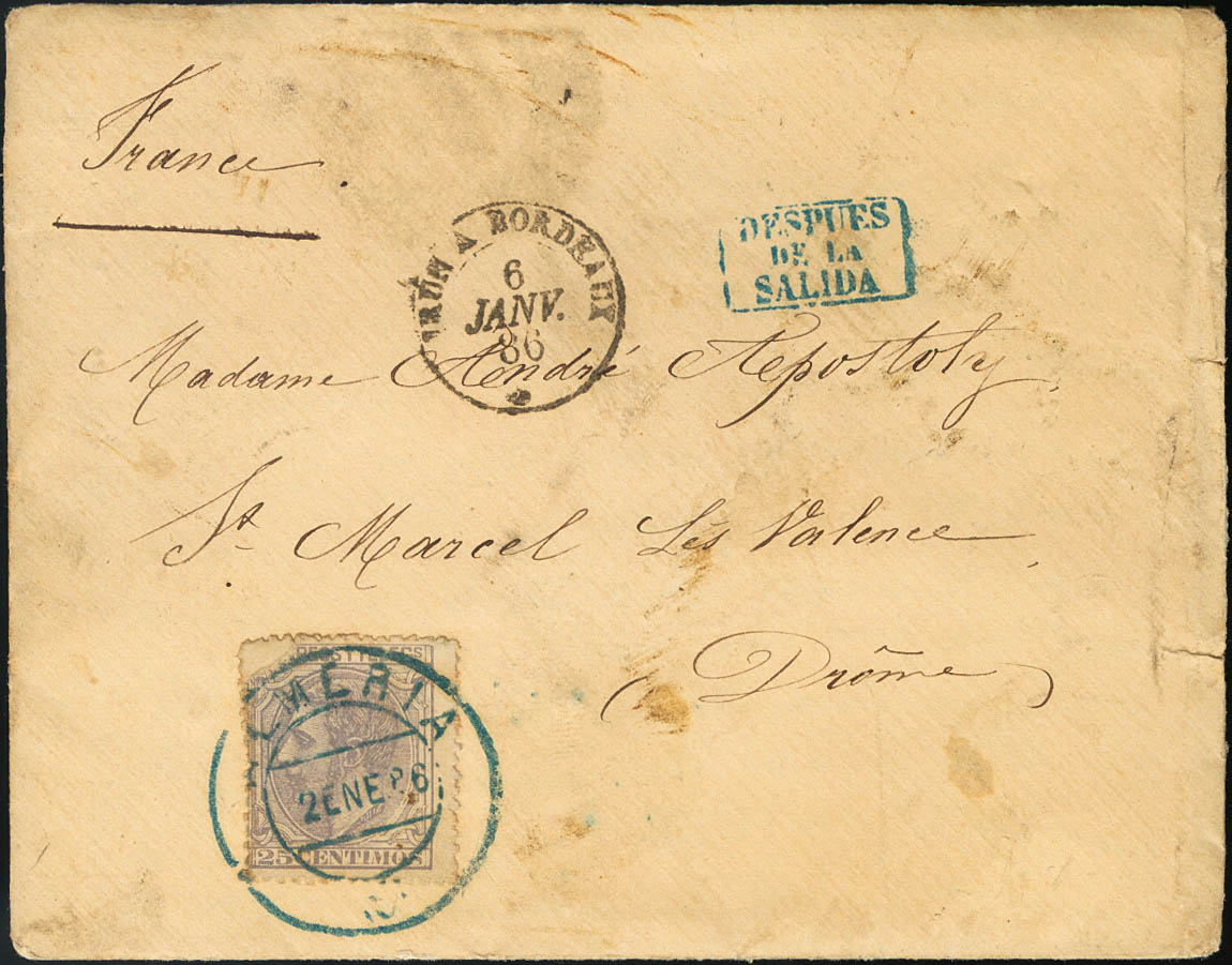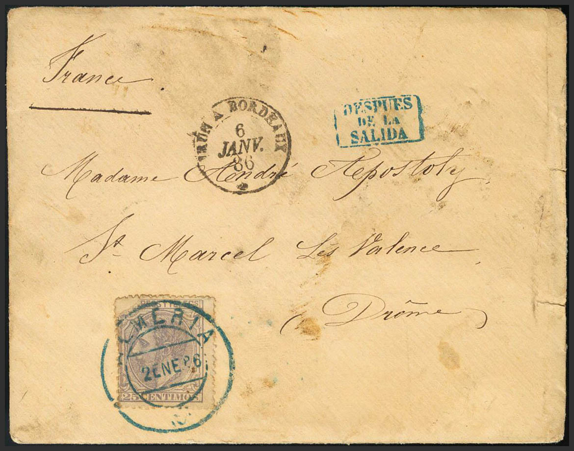 204. 1886. 25 cts blue gray. ALMERIA to SAINT MARCEL LES VALENCE (FRANCE). Date postmark ALMERIA (large type), in blue and on the front it marks DESPUES DE LA SALIDA, in blue. MAGNIFICENT AND RARE.