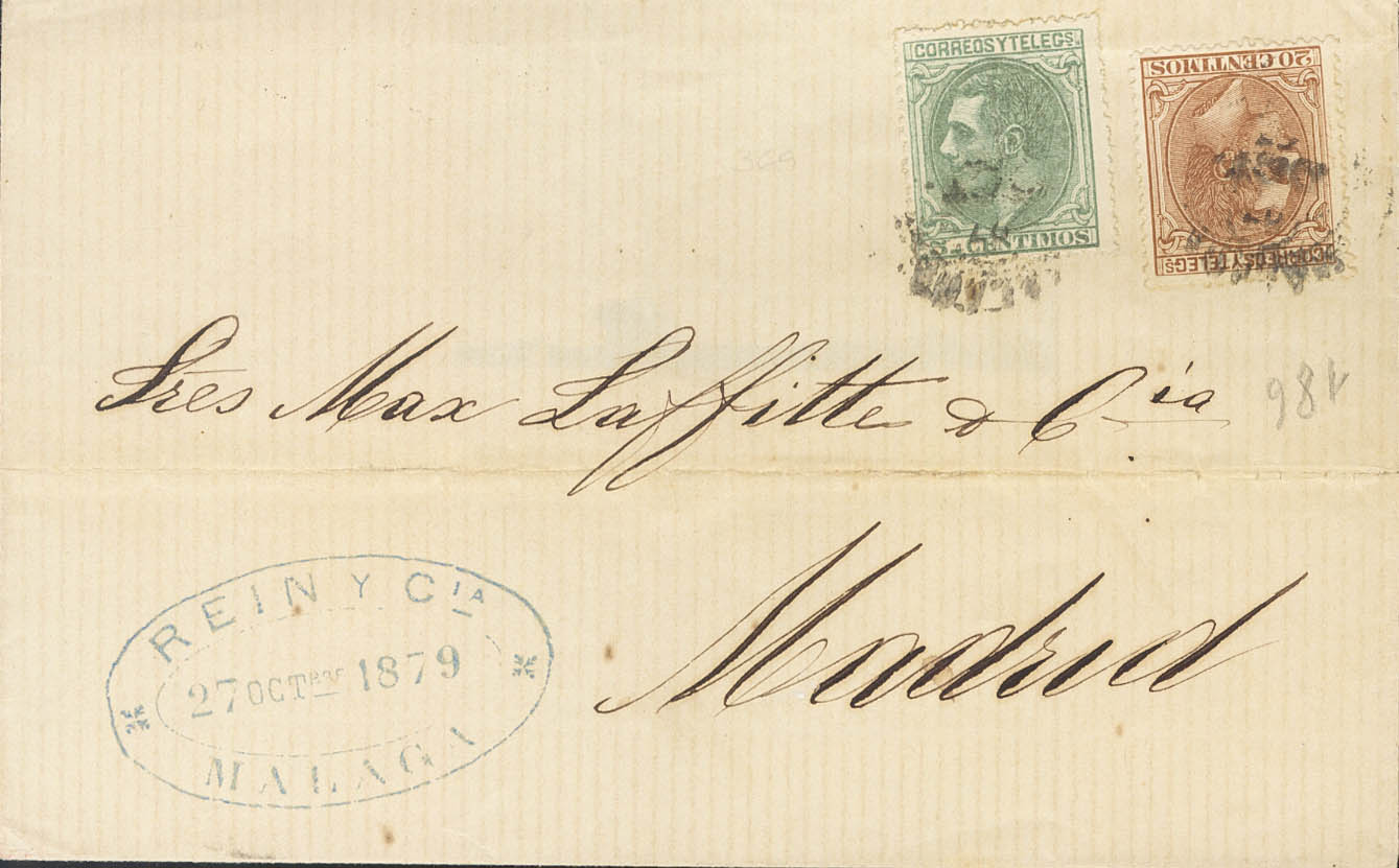 201, 203. 1879. 5 cts green and 20 cts red chestnut. MALAGA to MADRID. MAGNIFICENT AND UNUSUAL COMBINATION OF POSTAGE.