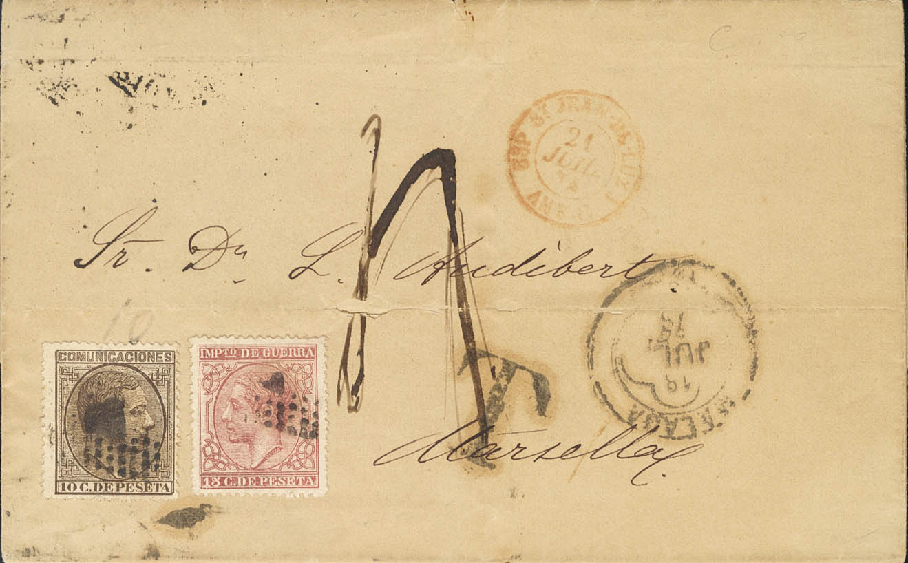 192, 188. 1878. 10 cts chestnut and 15 cts carmine. MALAGA to MARSEILLE (FRANCE) (slight erosion). Assessed upon arrival as the War Tax stamp is not considered valid as it is sent abroad. PRETTY.