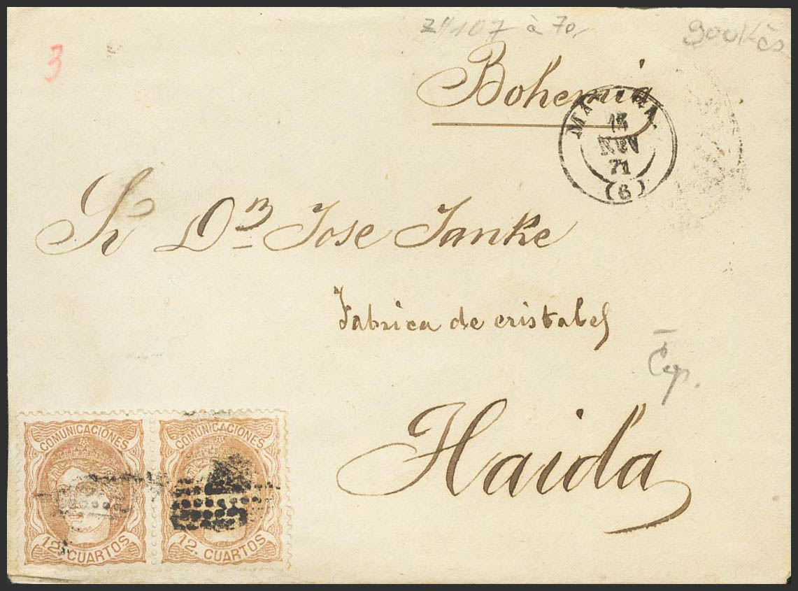 113(2). 1871. 12 red chestnut cuartos . MALAGA to HAIDA (BOHEMIA, AUSTRIA). Postage of 24 cuartos to cover the rate of 275 mils with an excess of 25 mils according to the rate in force since January 1869. MAGNIFICENT AND RARE.