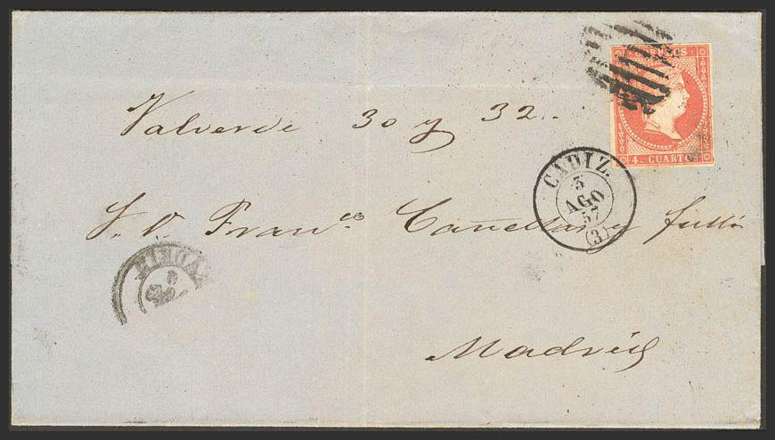 48. 1857. 4 red cuartos . CADIZ to MADRID. Postmark GRILL, next to CADIZ / (3).