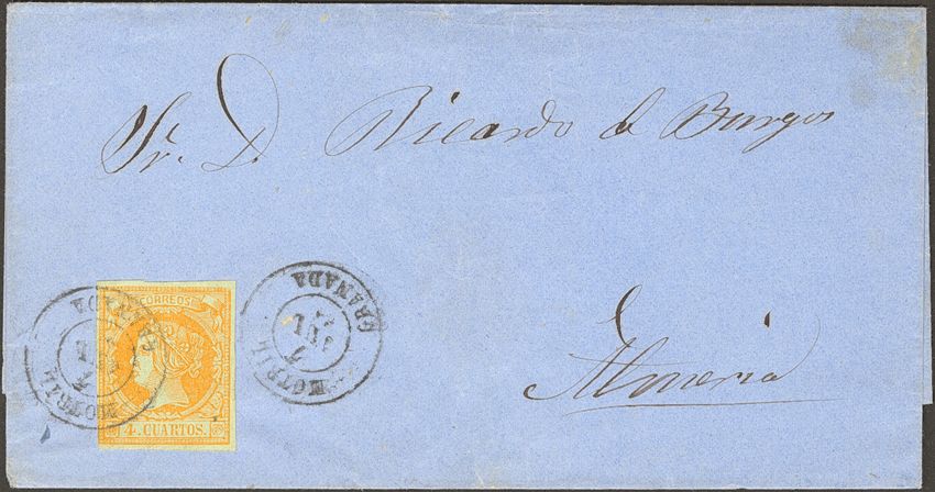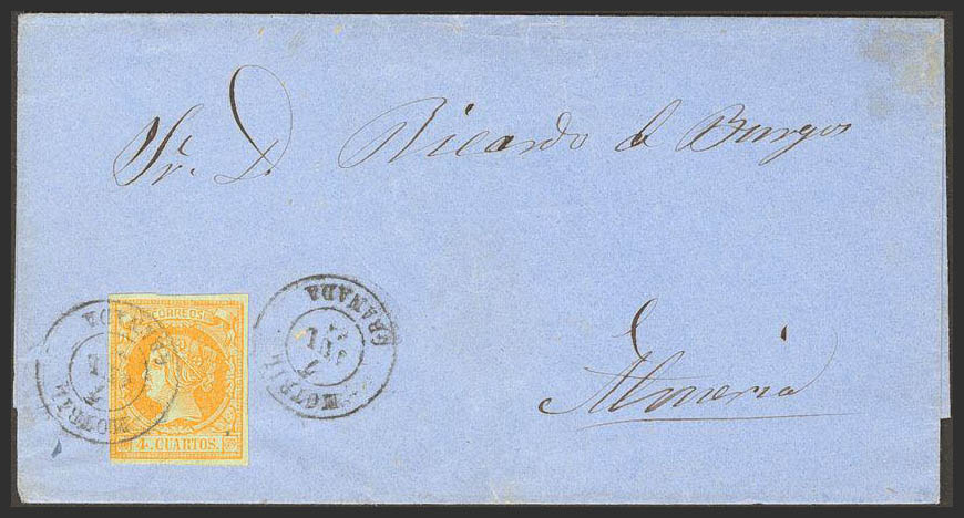 52. 1860. 4 cuartos yellow. MOTRIL to ALMERIA. Postmark MOTRIL / GRANADA. MAGNIFICENT.