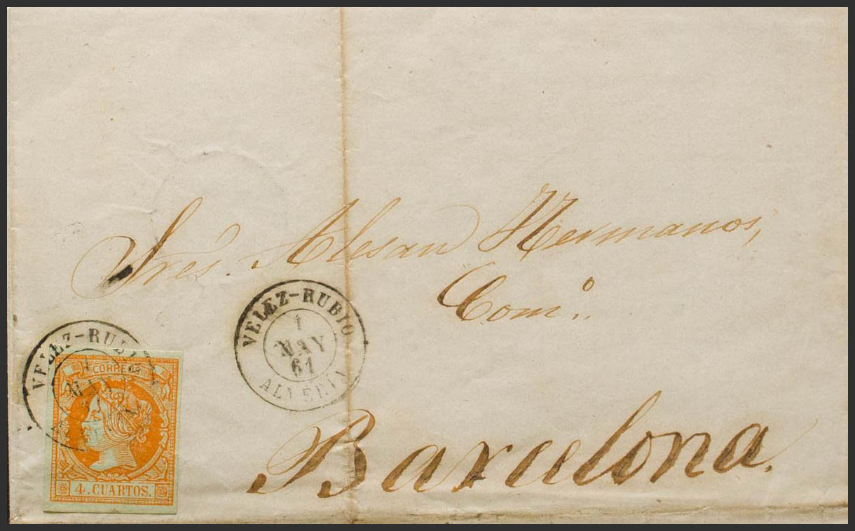 52. 1861. 4 orange cuartos . VELEZ-RUBIO to BARCELONA. Postmark VELEZ-RUBIO / ALMERIA. MAGNIFICENT.
