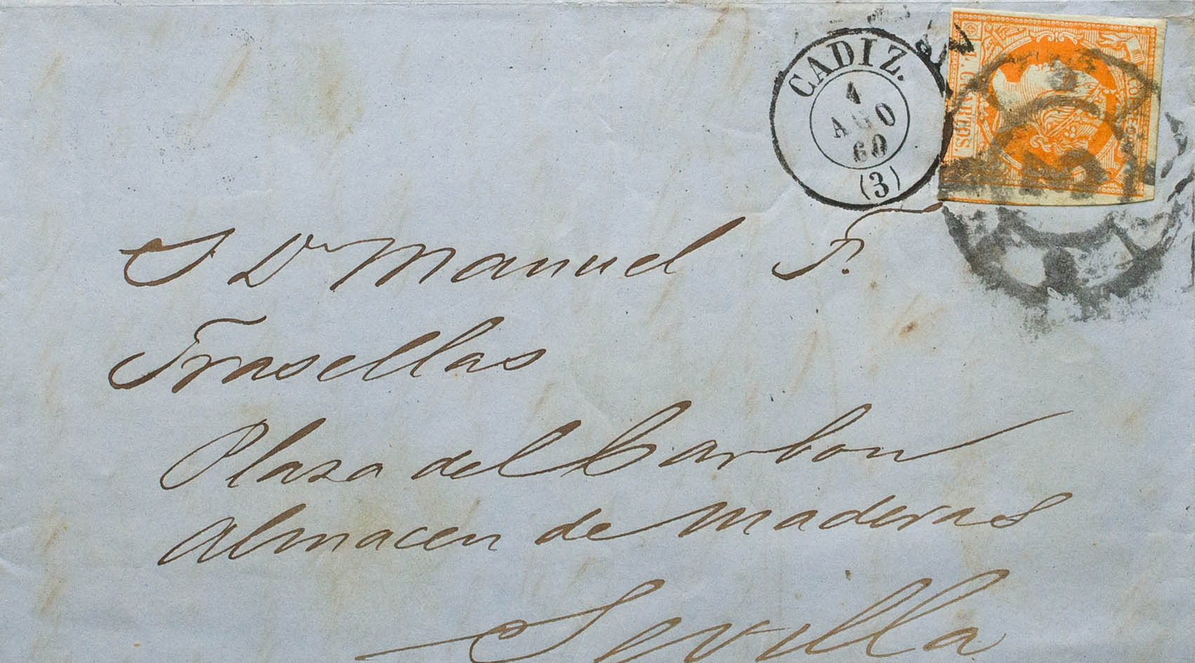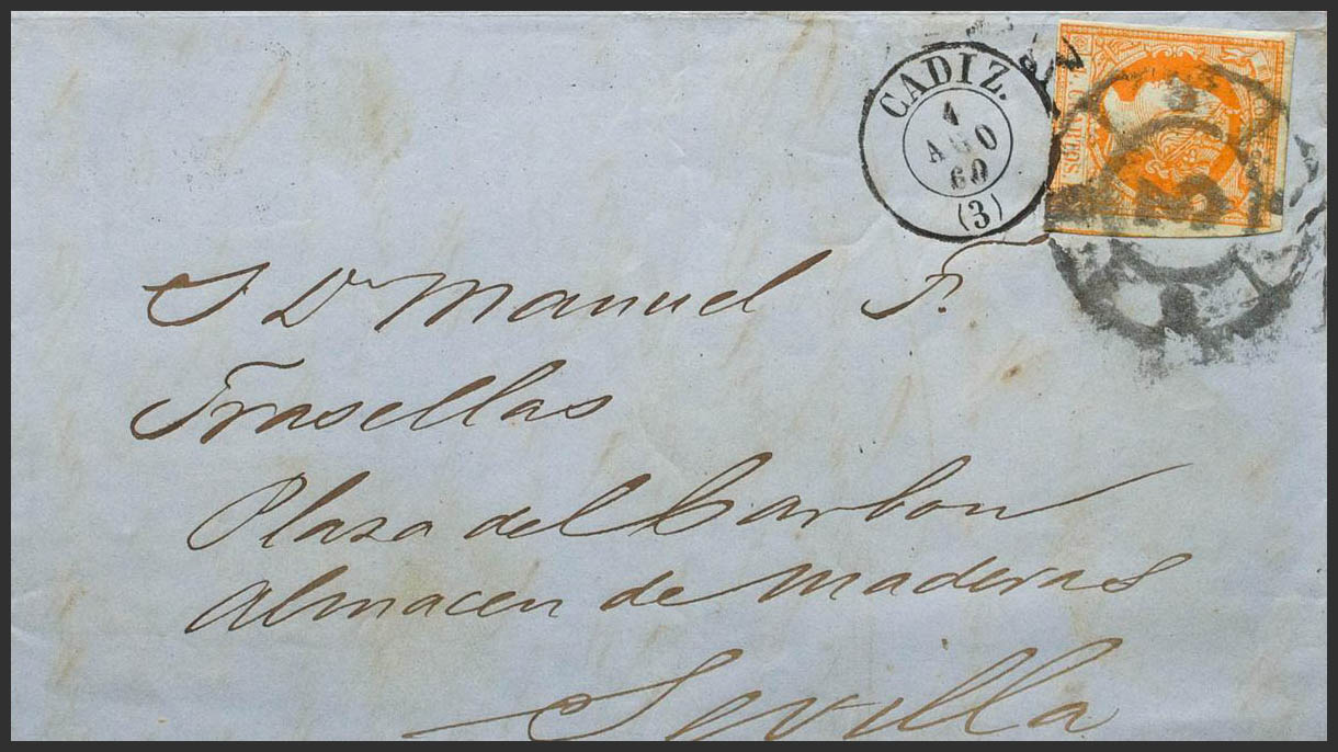 52. 1860. 4 orange cuartos . CADIZ to SEVILLE. Mixed postmark R.CARRETA Nº3 and dater CADIZ / (3). MAGNIFICENT.