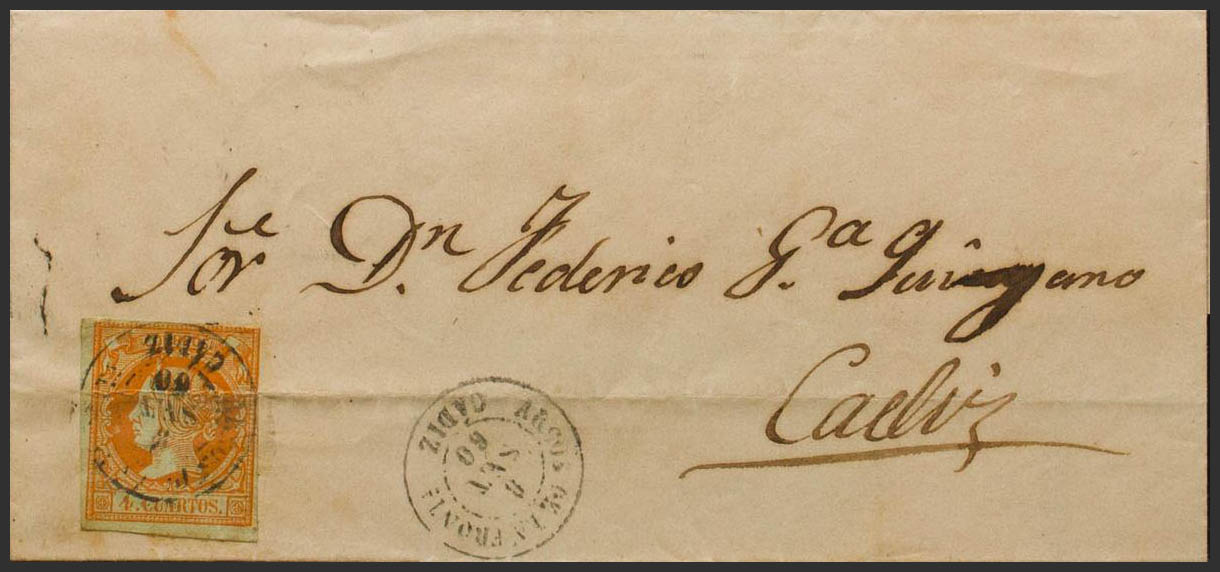52. 1860. 4 cuartos orange (archival fold). ARCHES OF THE BORDER to CADIZ. Postmark ARCOS DE LA FRONTª / CADIZ. PRETTY.