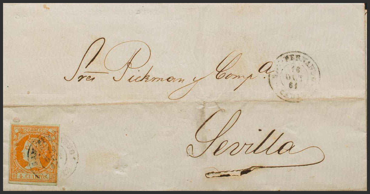 52. 1861. 4 orange cuartos . SAN FERNANDO to SEVILLE. Postmark SAN FERNANDO / CADIZ. MAGNIFICENT.